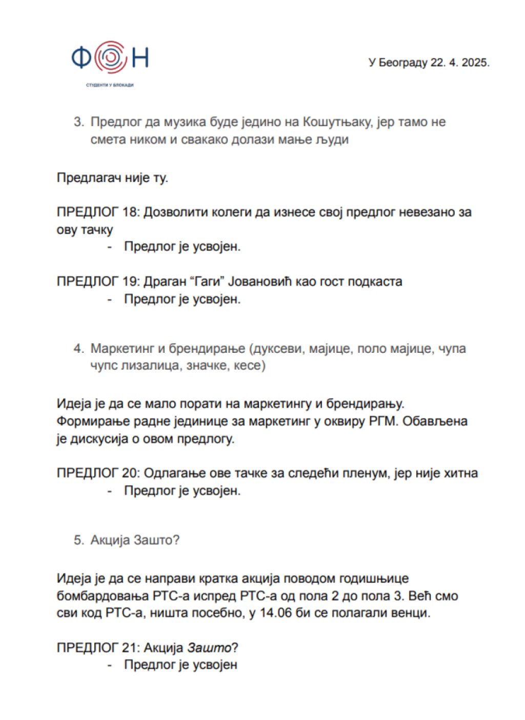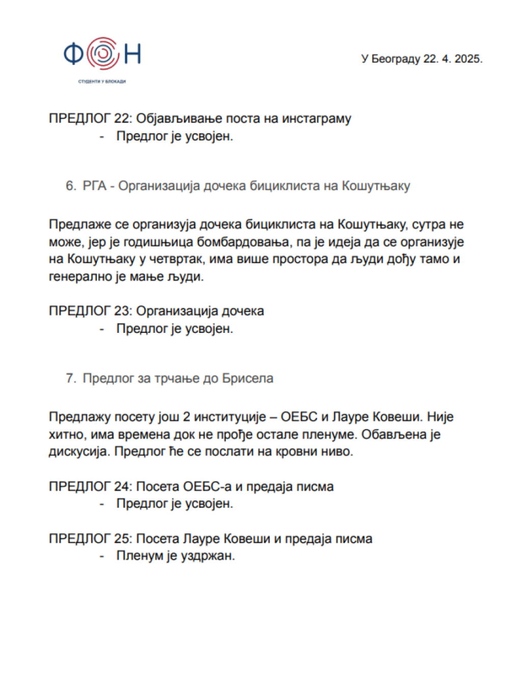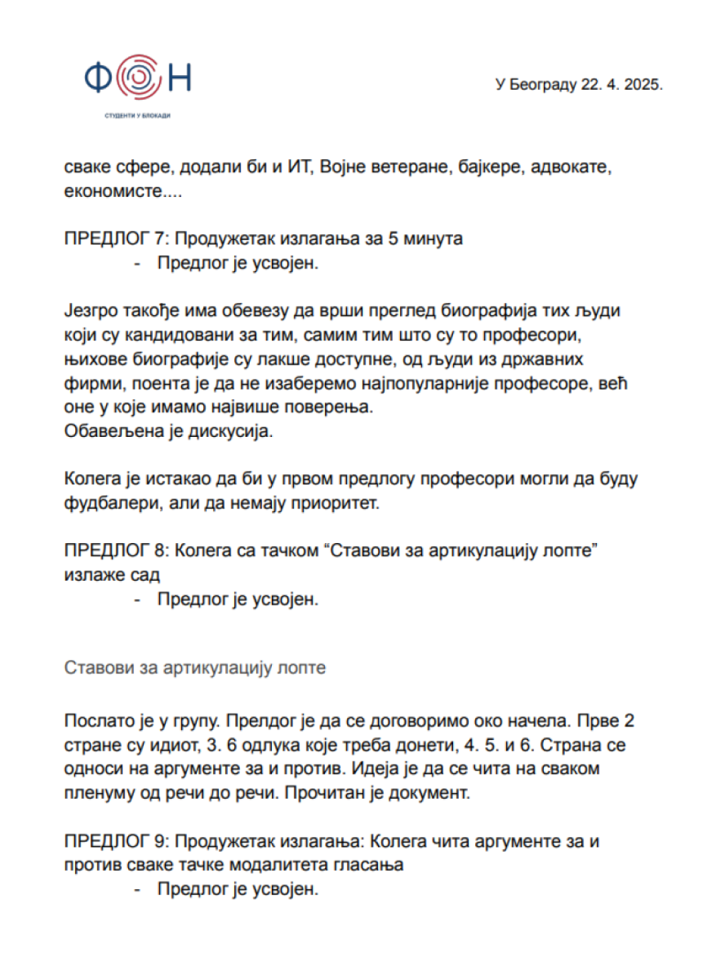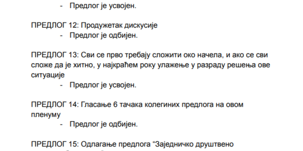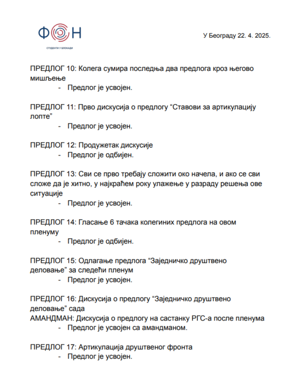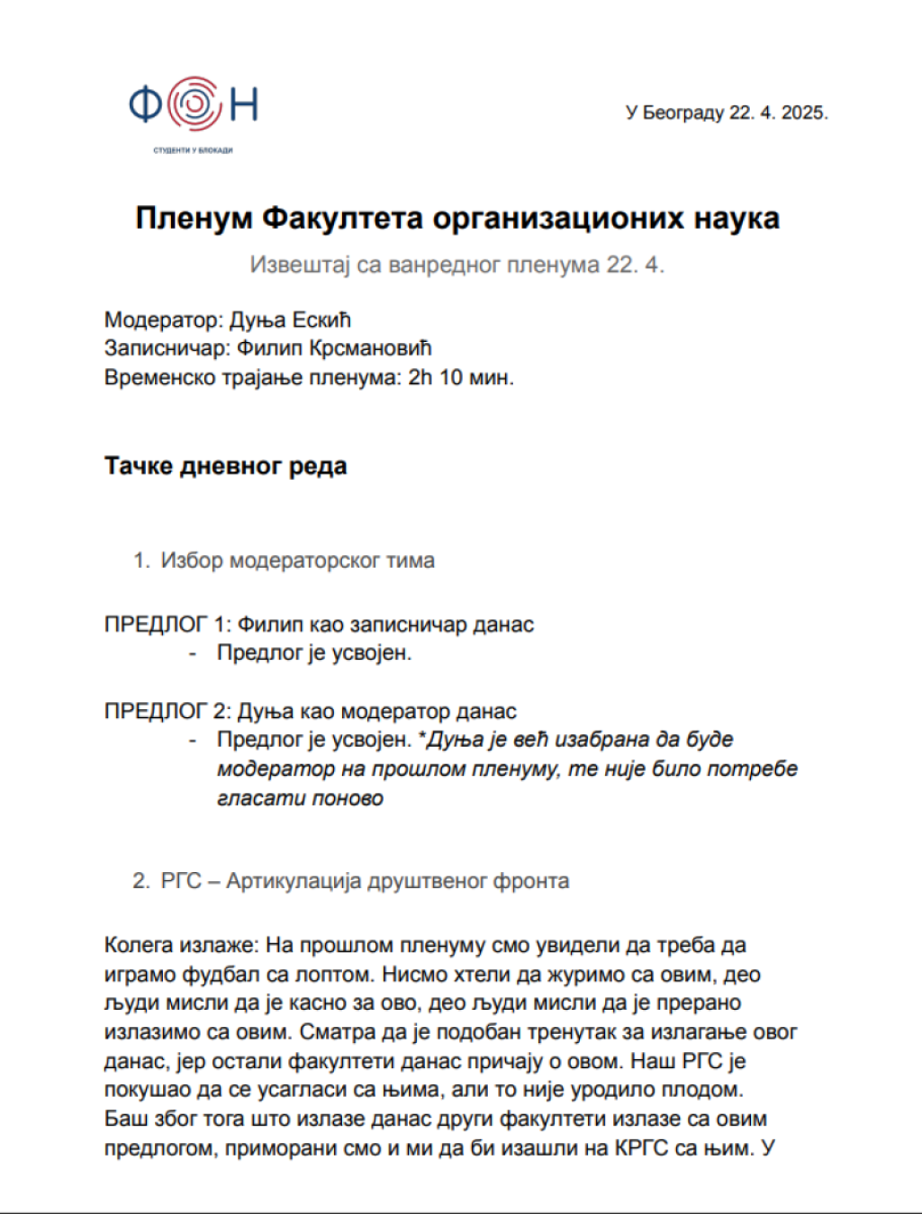 Plenum je održan 22. aprila, a ceo dokument obiluje šiframa koje blokaderi koriste kako bi se zaštitili od pravnih posledica.