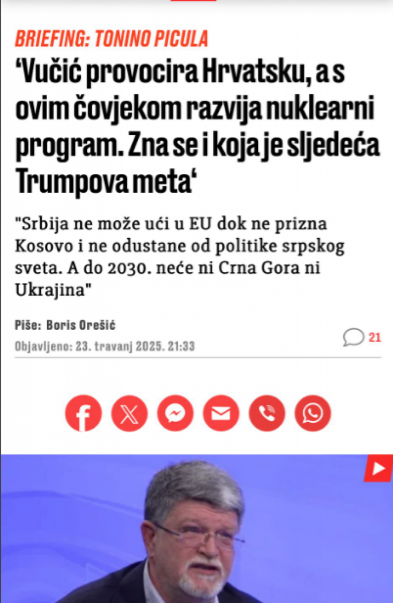 Picula je našao za shodno da komentariše političku situaciju u Srbiji, naravno sve vreme u tekstu pominjući ime predsednika Srbije Aleksandra Vučića, prenosi Alo.