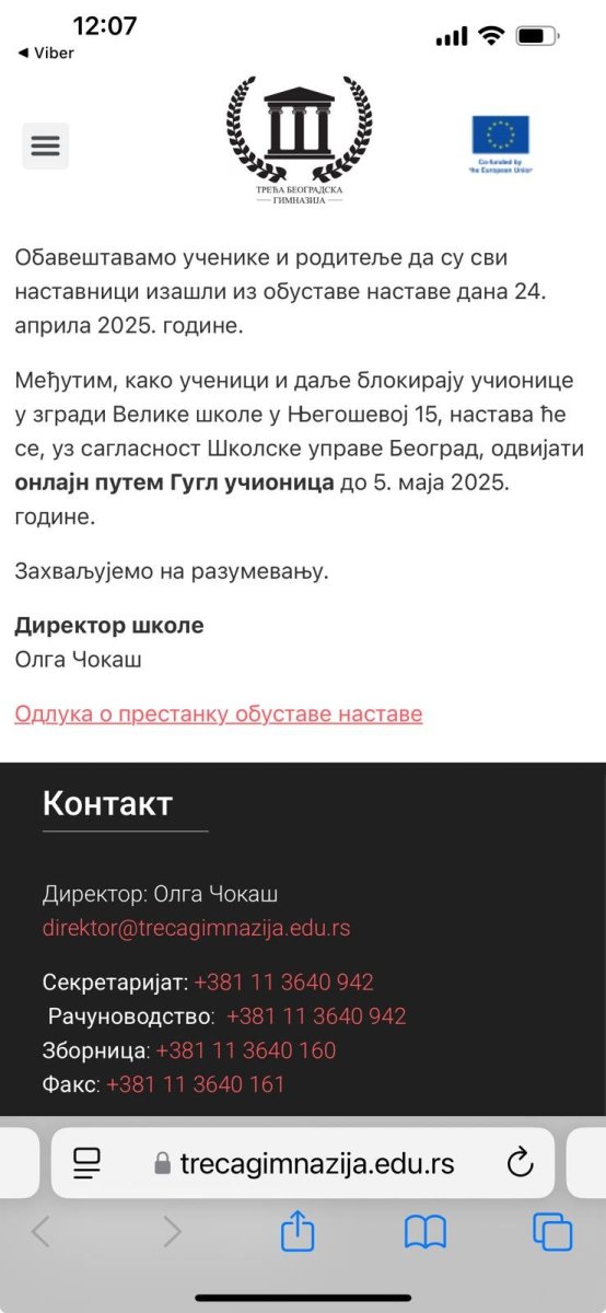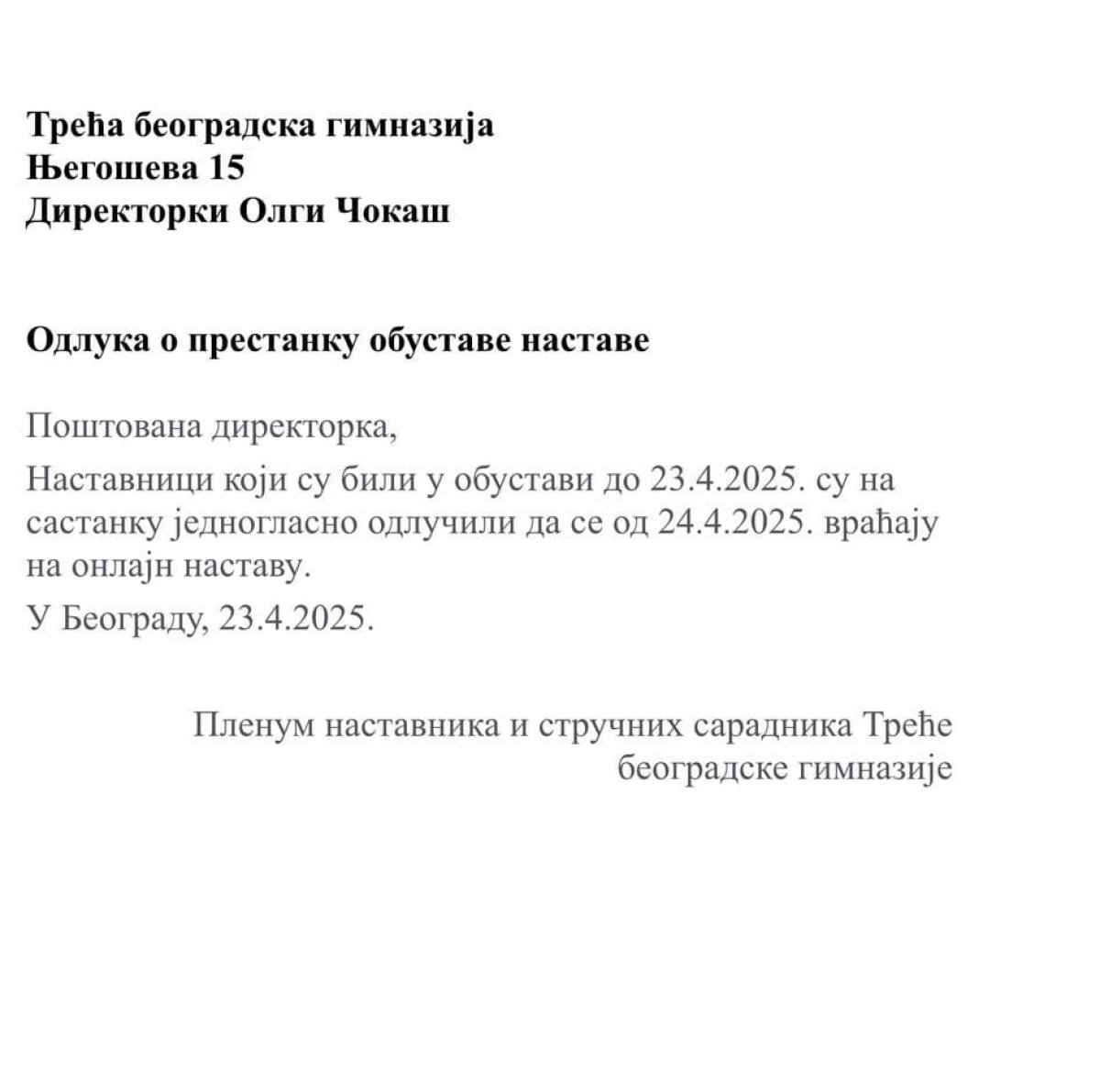 Međutim, kako su obavestili roditelje đaka ove ustanove, prisiljeni su da predaju onlajn, putem "Gugl učionice", jer učenici i dalje blokiraju učionice. Kako je navela direktorka škole, oni su ovu odluku doneli uz saglasnost Školske uprave Beograd, a nastava će se tako odvijati do 5. maja.