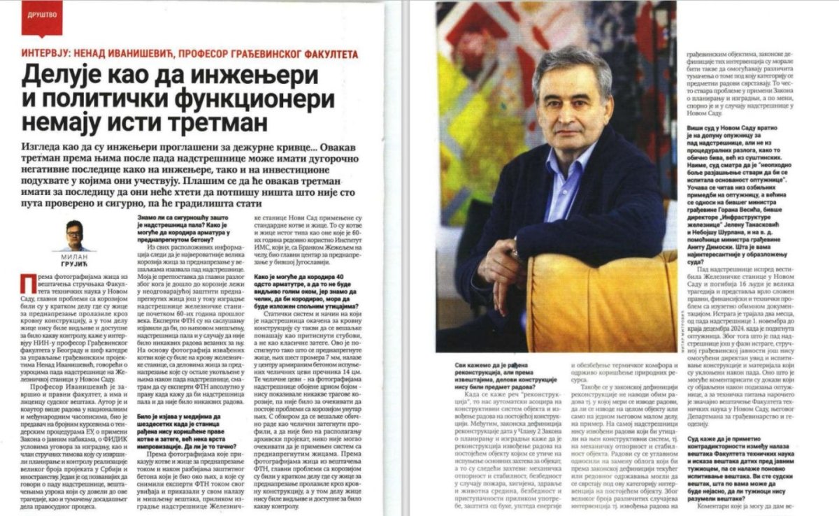 Profesor Građevinskog fakulteta u Beogradu i šef katedre za upravljanje građevinskim projektima Nenad Ivanišević govorio je za NIN o uzrocima pada nadstrešnice na Železničkoj stanici u Novom Sadu.
