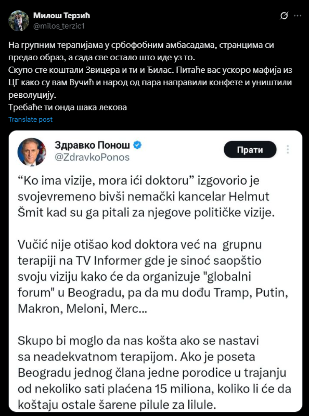 - Na grupnim terapijama u srbofobnim ambasadama, strancima si predao obraz, a sada sve ostalo što ide uz to. Skupo ste koštali Zvicera i ti i Đilas. Pitaće vas uskoro mafija iz CG kako su vam Vučić i narod od para napravili konfete i uništili revoluciju. Trebaće ti onda šaka lekova - istakao je Miloš Terzić.