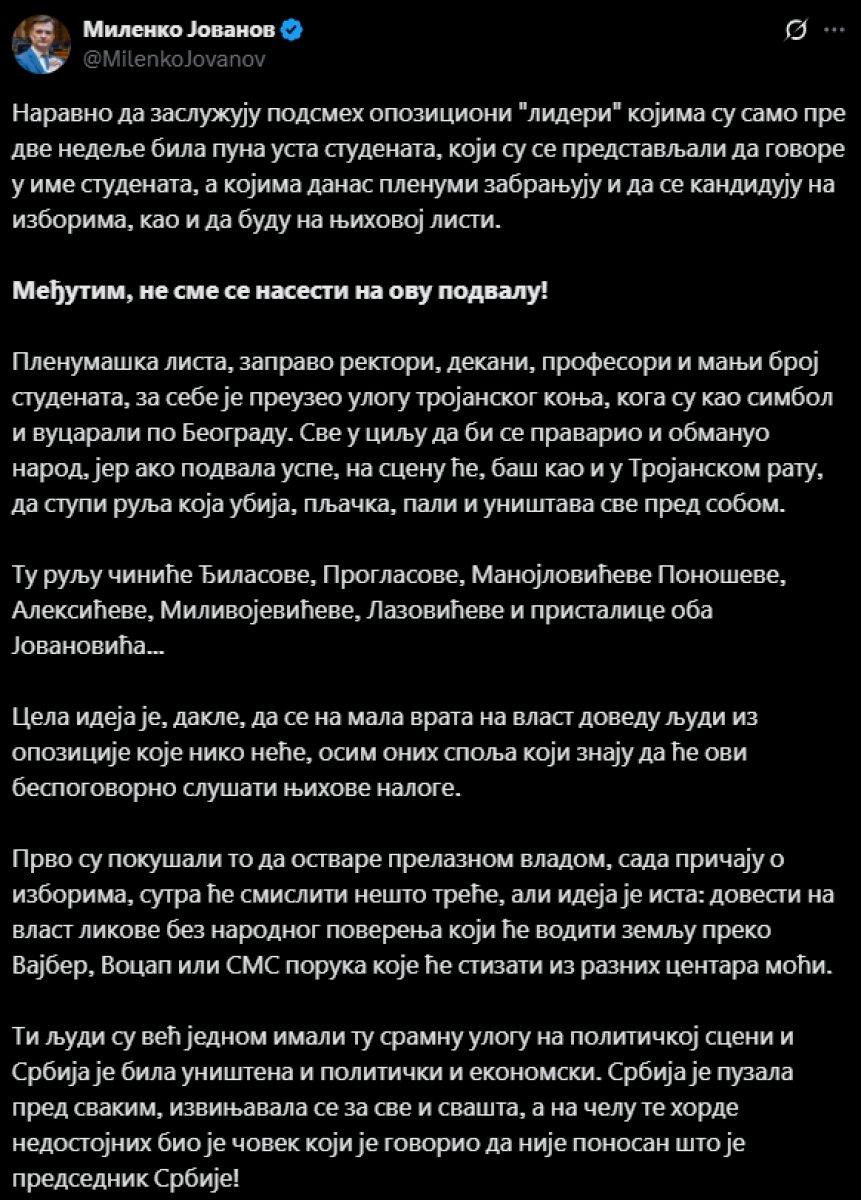 Naravno da zaslužuju podsmeh opozicioni "lideri" kojima su samo pre dve nedelje bila puna usta studenata, koji su se predstavljali da govore u ime studenata, a kojima danas plenumi zabranjuju i da se kandiduju na izborima, kao i da budu na njihovoj listi, napisao je na drušvenoj mreži "Iks" Milenko Jovanov.