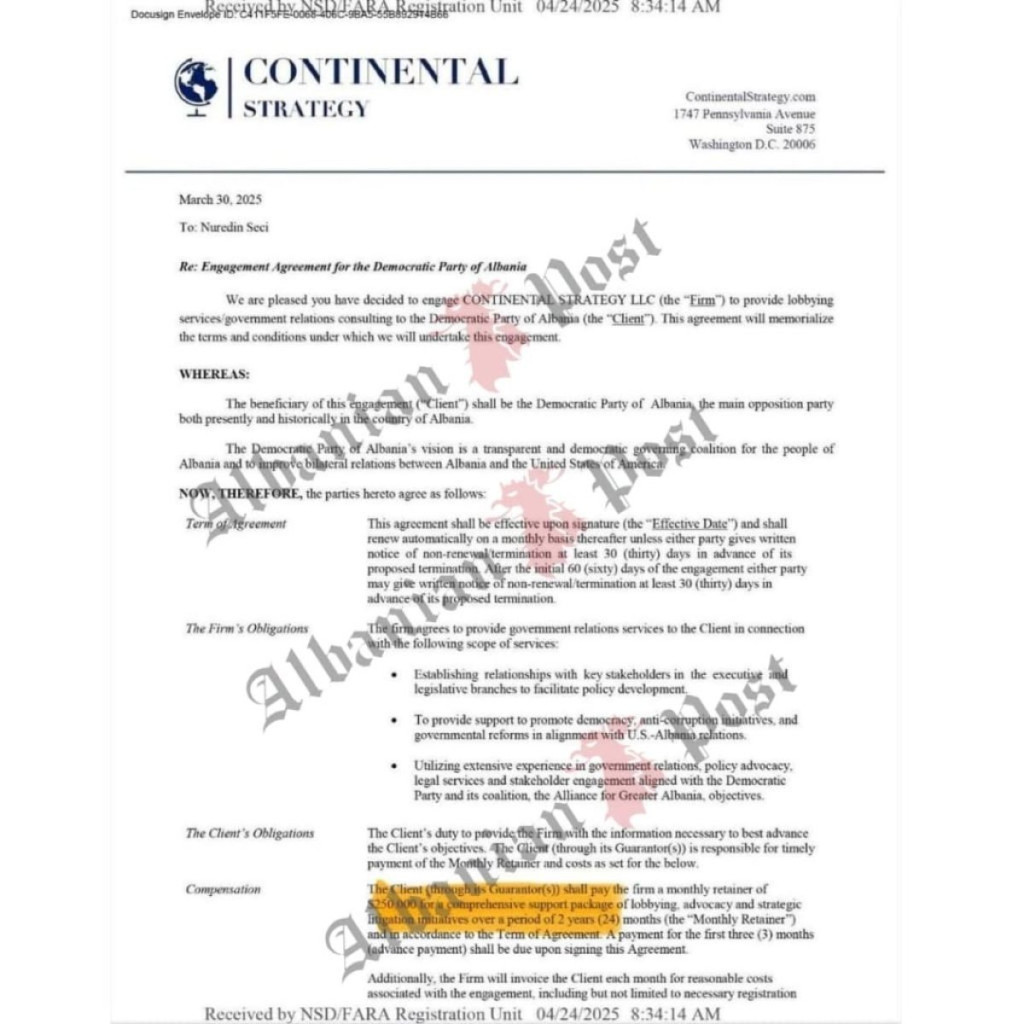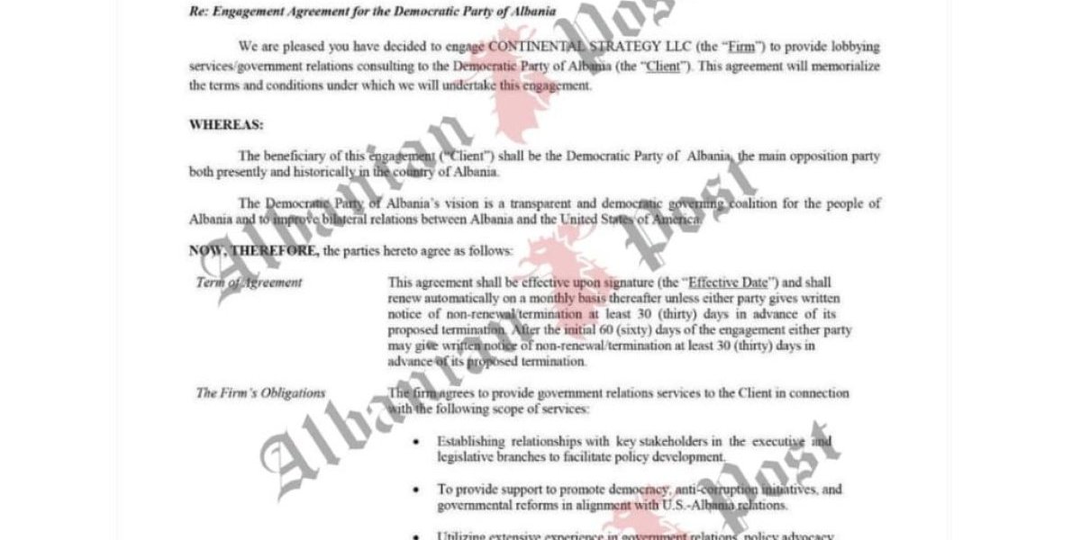 U ovom zvaničnom papiru navodi se da su se lobisti iz firme "Kontinental Stratedži" obavezali da će "pomoći u izgradnji odnosa sa ključnim akterima u američkoj administraciji i Kongresu", podržati demokratske reforme u Albaniji i unaprediti interese svojih klijenata.