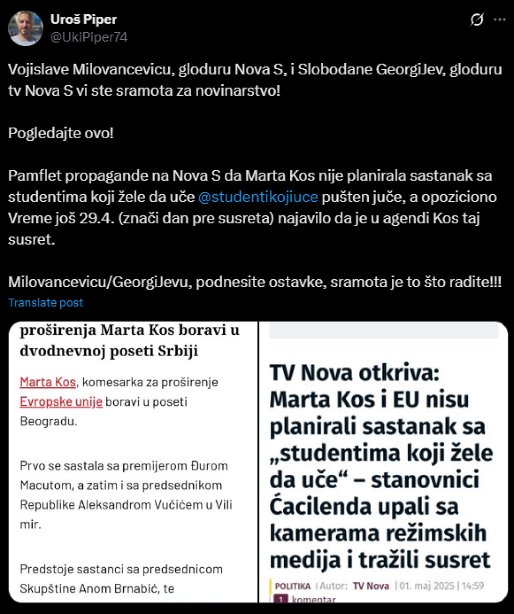 - Vojislave Milovančeviću, gloduru Nova S, i Slobodane Georgiev, gloduru TV Nova S vi ste sramota za novinarstvo! Pogledajte ovo! Pamflet propagande na Nova S da Marta Kos nije planirala sastanak sa studentima koji žele da uče, pušten juče, a opoziciono Vreme još 29.4. (znači dan pre susreta) najavilo da je u agendi Kos taj susret. Milovančeviću/Georgievu, podnesite ostavke, sramota je to što radite!!! - poručio je Piper.