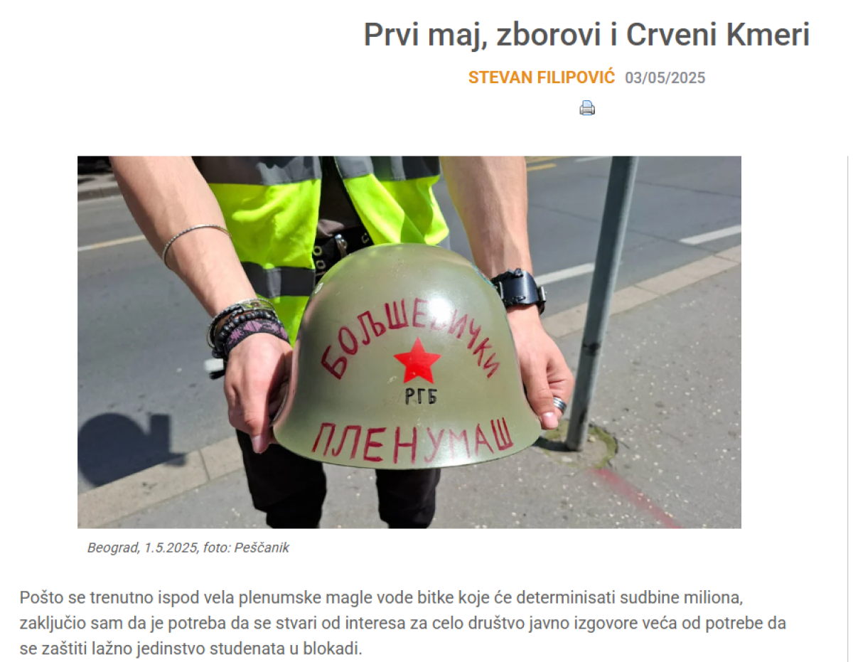 On je u autorskom tekstu za "Peščanik" pod naslovom "Prvi maj, zborovi i Crveni Kmeri" udario po studentima jer odbijaju da dozvole da dođe do političke artikulacije na skupovima, a same studente optužio za "lažno jedinstvo".