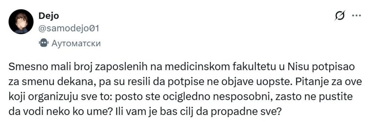 "Smešno mali broj zaposlenih na medicinskom fakultetu u Nišu potpisao za smenu dekana, pa su resili da potpise ne objave uopšte. Pitanje za ove koji organizuju sve to: pošto ste očigledno nesposobni, zašto ne pustite da vodi neko ko ume? Ili vam je baš cilj da propadne sve?", napisao je jedan od korisnika na društvenoj mreži Iks.