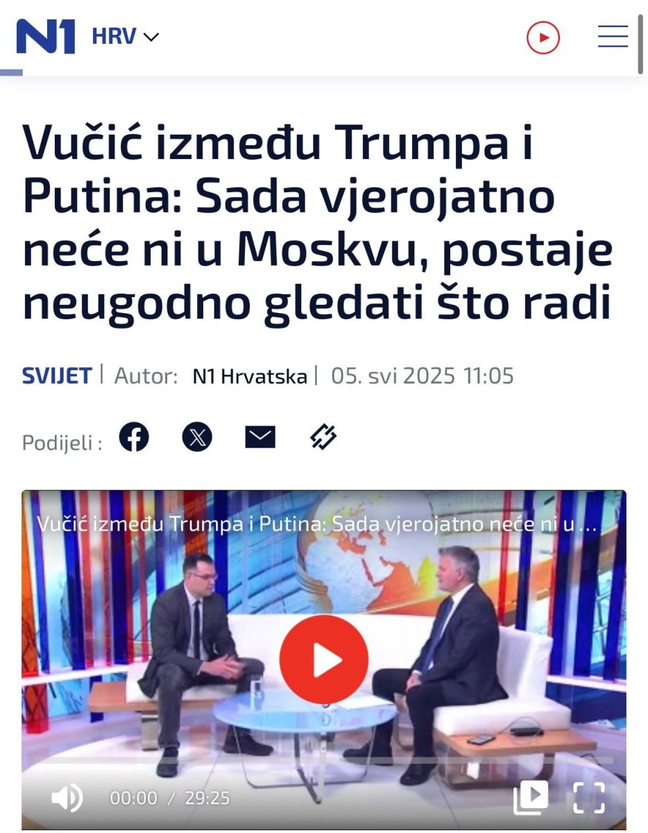 Preciznije, reč je o tekstu pod nazivom "Vučić između Trumpa i Putina: Sada verovatno neće ni u Moskvu, postaje neugodno gledati šta radi", kojim hrvatski N1 nastavlja kampanju protiv srpskog predsednika.