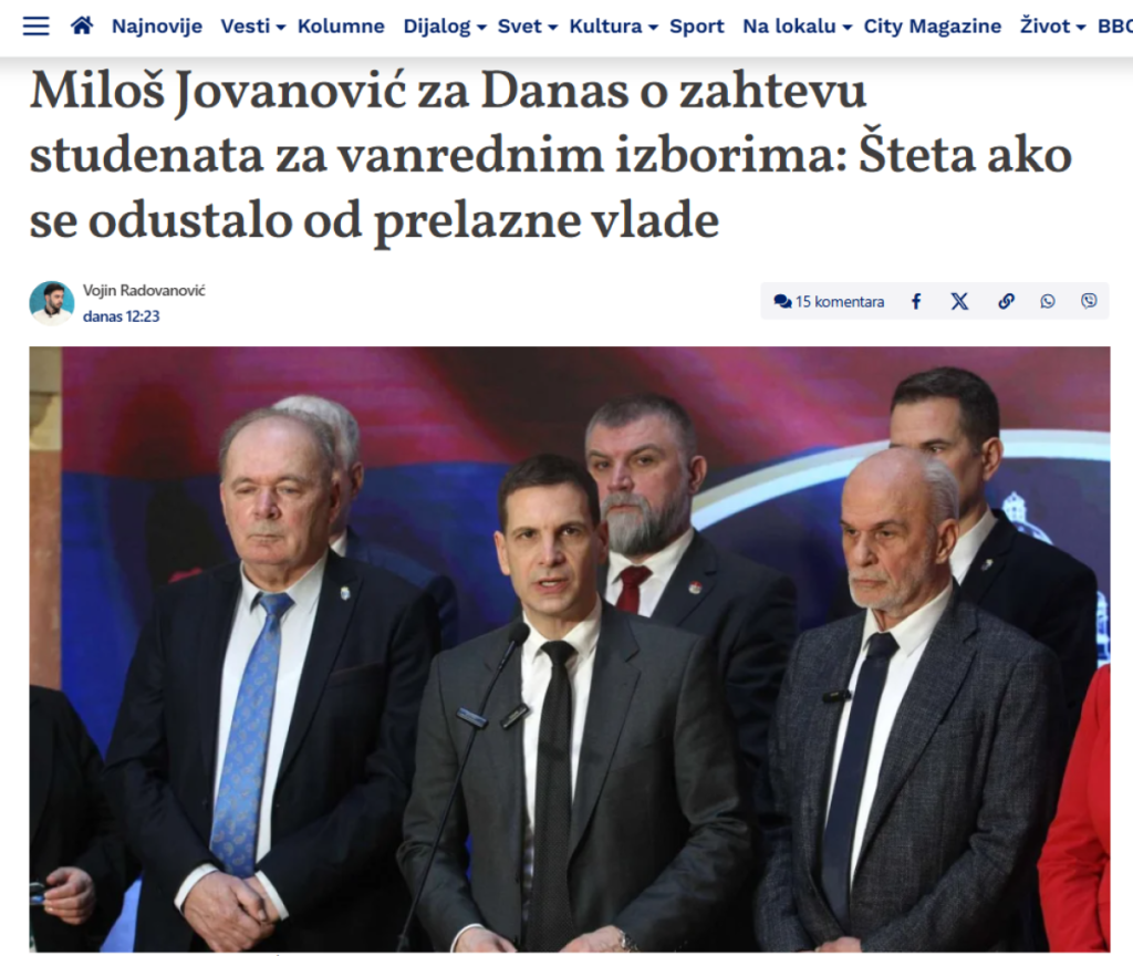 Na direktno pitanje tajkunskog megafona, niskotiražnog tabloida Danas da se izjasni da li podržava studentske zahteve za izborima, Jovanović neodređeno, ali ipak očigledno, odgovara da je velika šteta što se odustalo od prelazne vlade.