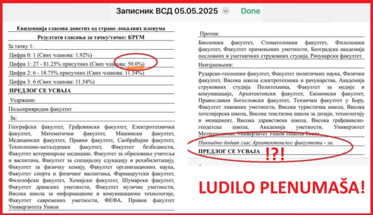 Dalje, kao što je opozicija razjedinjena, posvađana, nesaglasna u svemu, pa i po pitanju izbora, isto tako su razjedinjeni i studenti blokaderi. Na „glasanju“ na beogradskom takozvanom „Vrhovnom savetu delegata (VSD), koji je održan 5.5.2025., navodno 50 odsto "delegata" glasalo je za izbore, što je organizatorima tog sastanka bilo dovoljno da proglase da je to većina i da su studenti blokaderi za održavanje izbora. Iz haotičnog „zapisnika“ se vidi da u glasanju nije učestvovala većina fakulteta izvan Beograda, već uglavnom fakulteti i više škole iz Beograda. A od tih iz Beograda, najmanje 50 odsto nije bilo za to da studenti traže raspisivanje izbora. Za to da se izbori raspišu nisu bili sledeći fakulteti: Biološki, Fizički, Stomatološki, Filološki, Arhitektonski, Ekonomski, Bogoslovski, FPU, RAF, BAPUS, RGF, FPN, VŠER, ASSP, FMK, TF Bor, FLU, VTŠ, VHŠ, VTŠDTM, VZŠ, VGGŠ, Akademija umetnosti, Univerzitet Metropolitan, Univerzitet Union Nikola Tesla itd. Naknadno je promenjen glas Arhitektonskog fakulteta. Kao što vidite, kada se posmatraju svi fakulteti iz Srbije, drastična manjina je donela odluku da traži raspisivanje izbora.