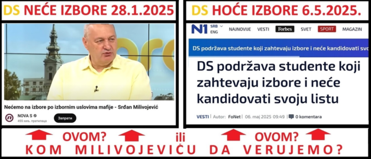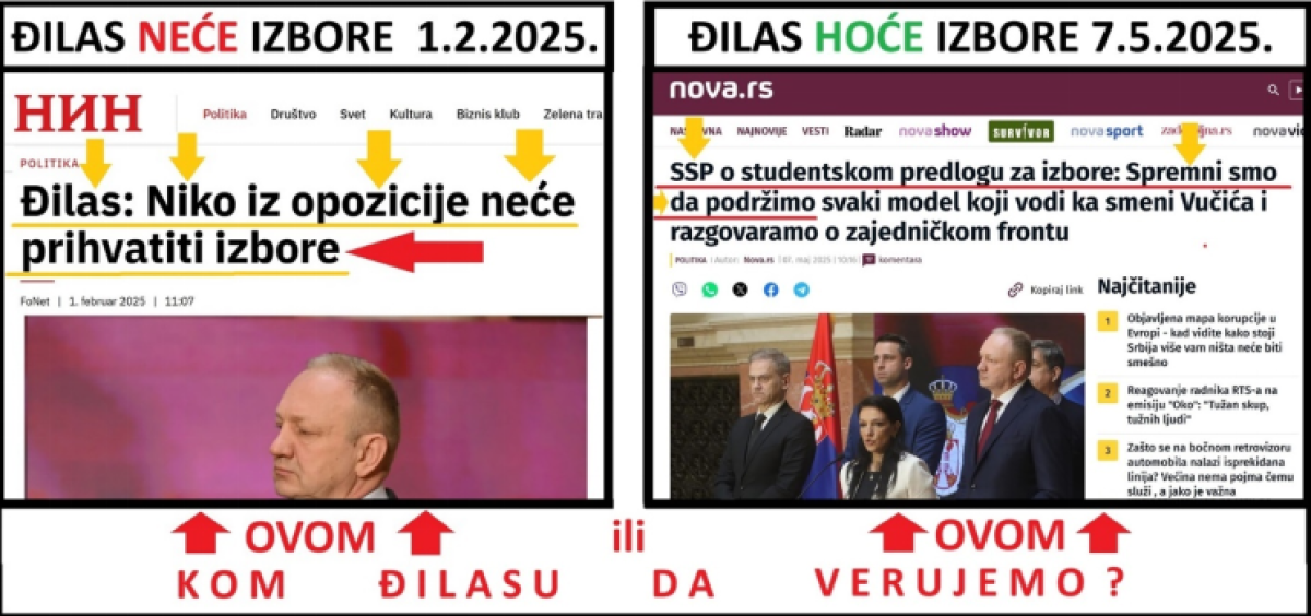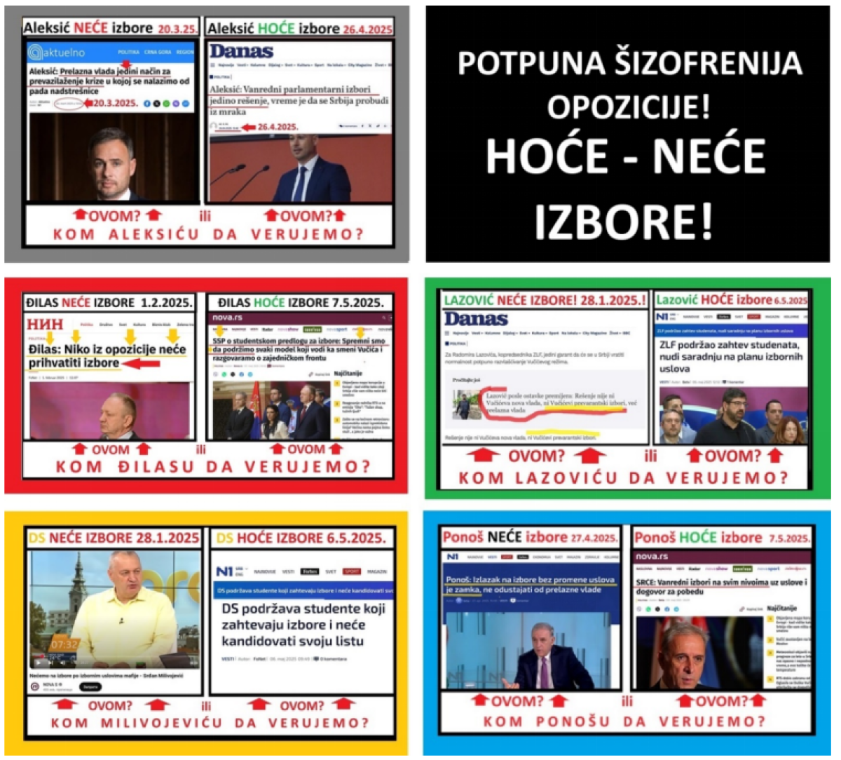 da se traže izbori. U ovakvoj situaciji izbori bi izazvali još već haos“. List „Danas“ u tekstu od 28.01.2025., pod nazivom „Trenutni presek situacije – hoće li opozicija na izbore ili ne?“, podseća i kaže: „Partije opozicije zasad su složne u tome da za njih nema novih izbora. Opozicija zasad i dalje insistira na ispunjavanju zahteva studenata i na formiranju prelazne vlade“. U tom tekstu Dragan Đilas, lider SSP, za Danas kaže: „Nema ni priče o izborima, a kamoli izbora, bez ispunjenja svih studentskih zahteva“. Lider DS Srđan Milivojević poručuje: „Da Vučić zaboravi na bilo kakve izbore, jer se studenti i građani sada pitaju kako će izgledati naše društvo. Demokratska stranka u Vučićevoj izbornoj farsi neće učestvovati, jer bi to bilo ravno izdaji hrabrih i dostojanstvenih studenata“. Radomir Lazović, kopredsednik ZLF, kaže: „Jedini garant da će se u Srbiji vratiti normalnost je potpuno razvlašćivanje Vučićevog režima. Rešenje nije ni Vučićeva nova vlada, ni Vučićevi prevarantski izbori“. Predsednik SSP, Dragan Đilas u intervjuu za TV Insajder, 1.2.2025. kaže: „Niko iz opozicije neće prihvatiti eventualne izbore, jer oni koji se protive aktuelnoj vlasti ne pristaju na takve manipulacije“. Zdravko Ponoš je 27.4.2025. godine rekao: „Izlazak na izbore bez promene uslova je zamka, ne odustajati od prelazne vlade“. Većina lidera opozicije je bila oštro protiv izbora. Kopernikanski obrt, okret od 180 stepeni, potpuno drugačija pesma, usledila je krajem aprila, i početkom maja 2025. Evo 5 primera šizofrenije opozicije!