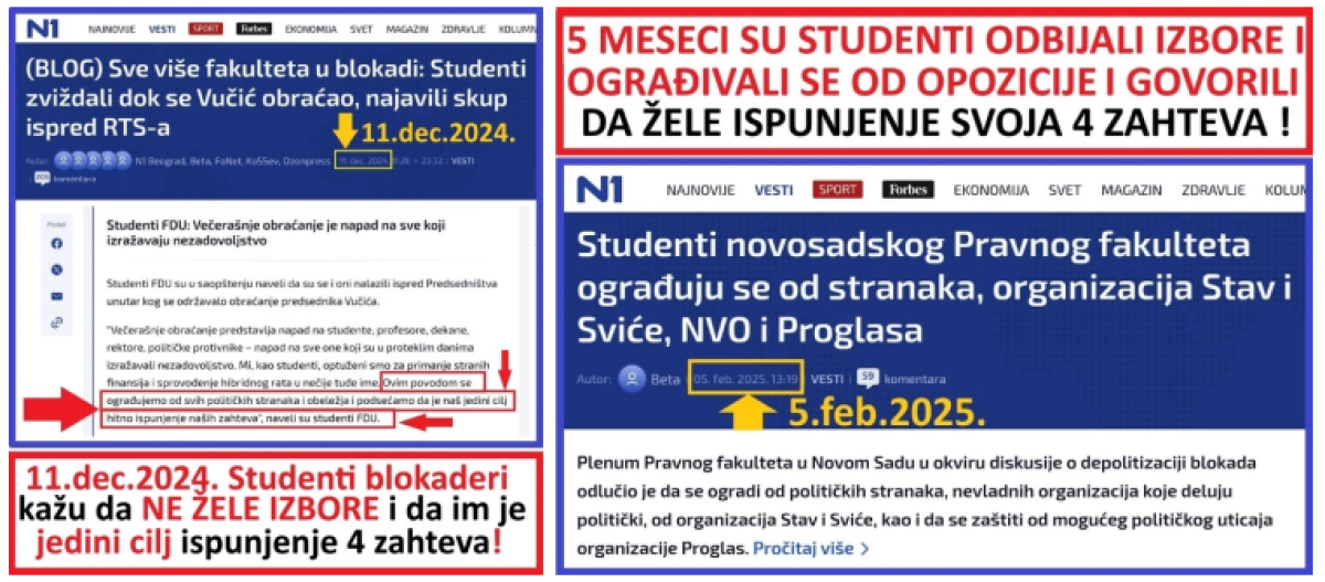 Tokom 6 meseci blokada, Aleksandar Vučić i SNS, sve vreme nude opoziciji i blokaderima i izbore i referendum o poverenju predsedniku Vučiću. Tokom pet i po meseci, opozicija i blokaderi su ovo odbijali. Opozicione stranke su pretile nasiljem ako se raspišu izbori. Studenti blokaderi su stalno ponavljali da se ograđuju od svih političkih stranaka i obeležja, da ne žele izbore, i da je njihov jedini cilj ispunjenje njihova 4 zahteva. Sve ovo su opozicija i blokaderi ponavljali do pre 10 dana. Odjednom su studentski plenumi, jedan po jedan, počeli da govore da žele izbore. Najverovatnije zbog toga što su videli da su im protesti i blokade potpuno propali i osuli se. U poslednjih 3 dana, i sve opozicione stranke su počele da pevaju drugu pesmu, i podržale su zahtev studenata, izuzev DSS.