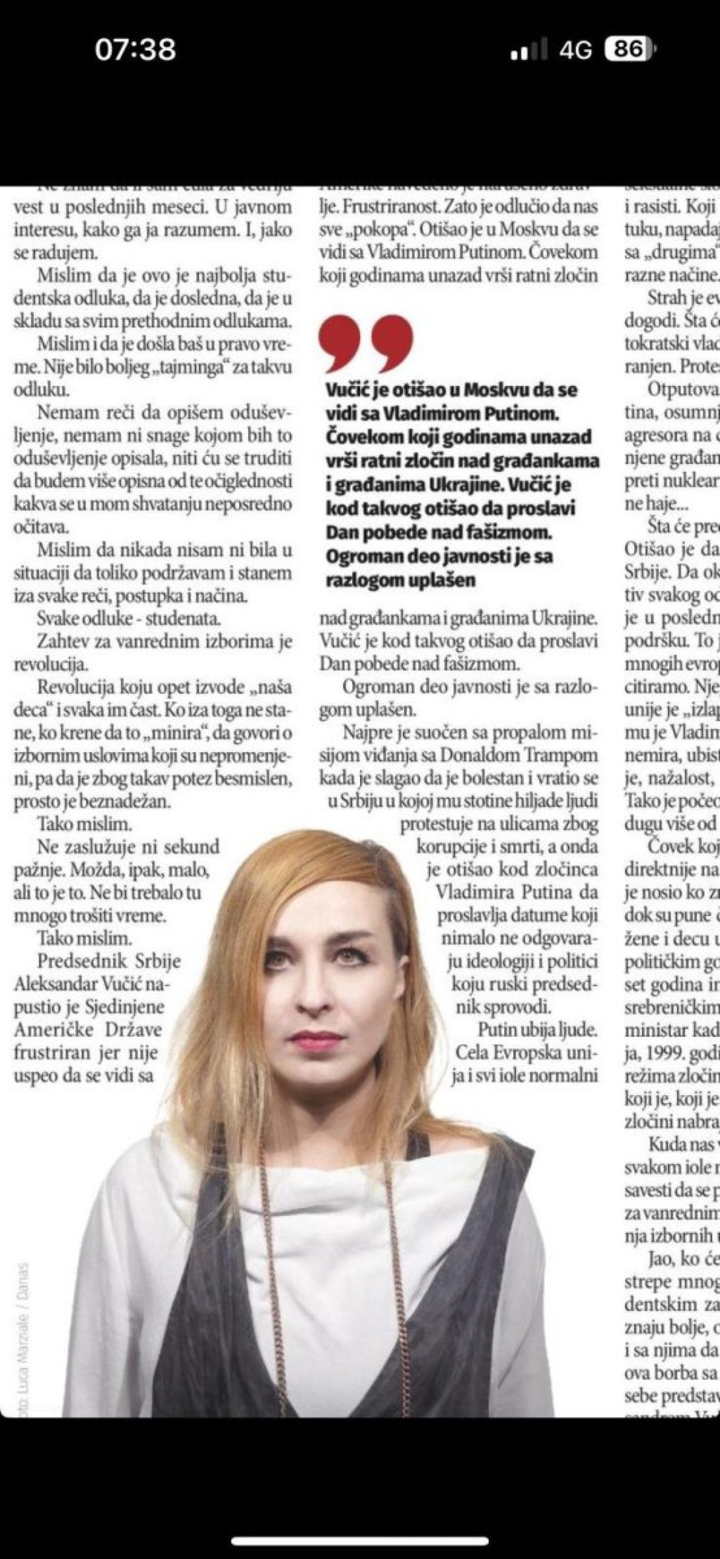U tekstu se Vučiću zamera što je otišao u Moskvu i sreo se sa ruskim predsednikom Vladimirom Putinom, kojeg nazivaju "ratnim zločincem".