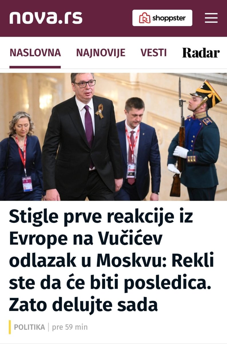 Opozicioni portal Nova kao glavnu vest drži tekst pod naslovom ''Stigle prve reakcije iz Evrope na Vučićev odlazak u Moskvu: Rekli ste da će biti posledica. Zato delujte sada''.