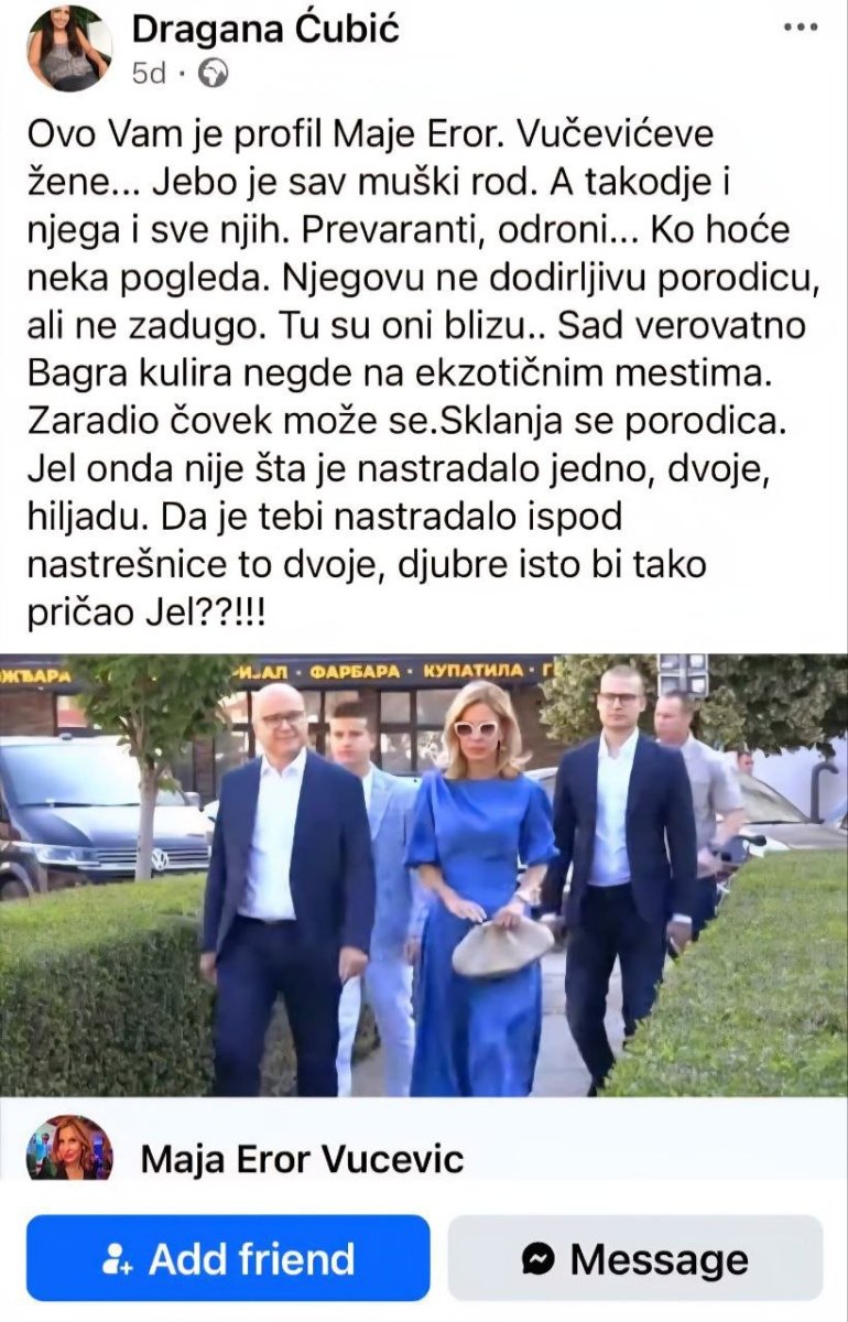 Ona je na svom profilu na Fejsbuku objavila profil žene prvog čoveka SNS-a, iznevši ozbiljne pretnje i uvrede na račun bivšeg premijera, njegove supruge i sinova.