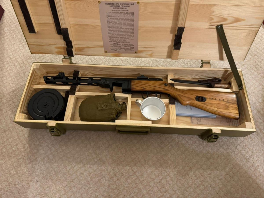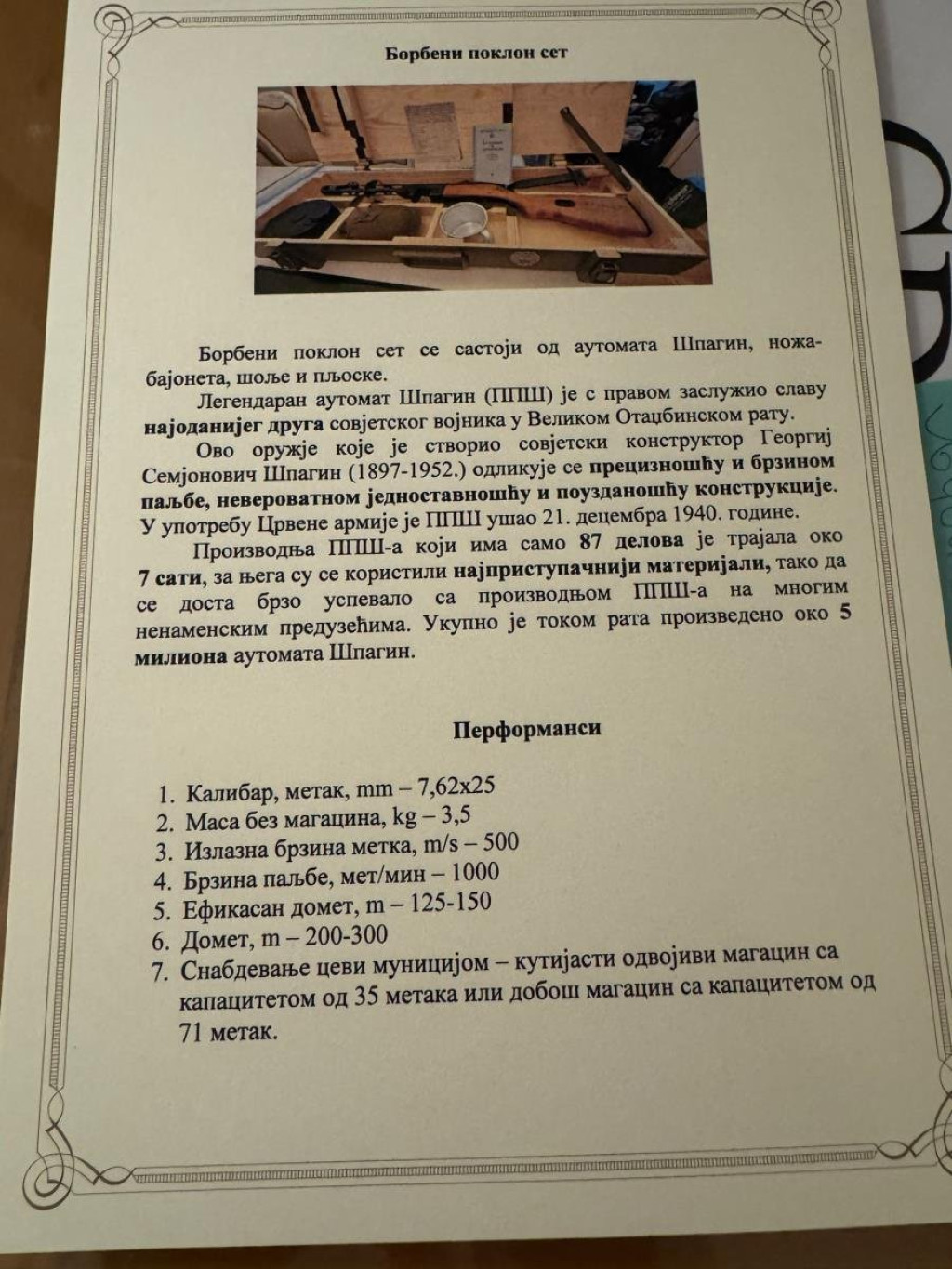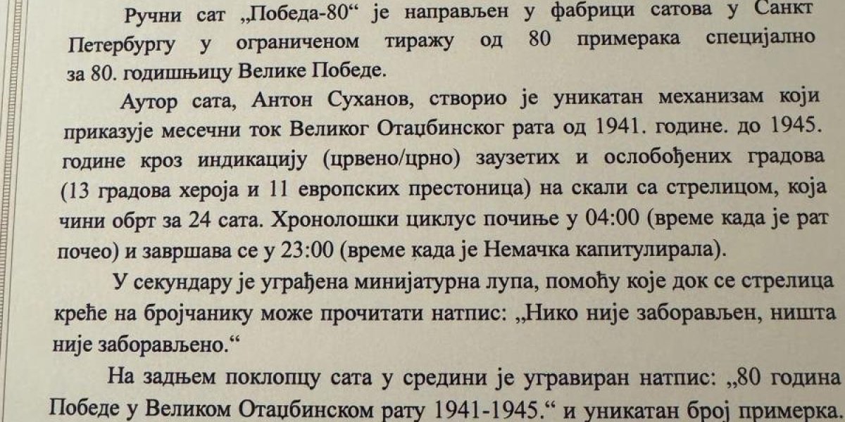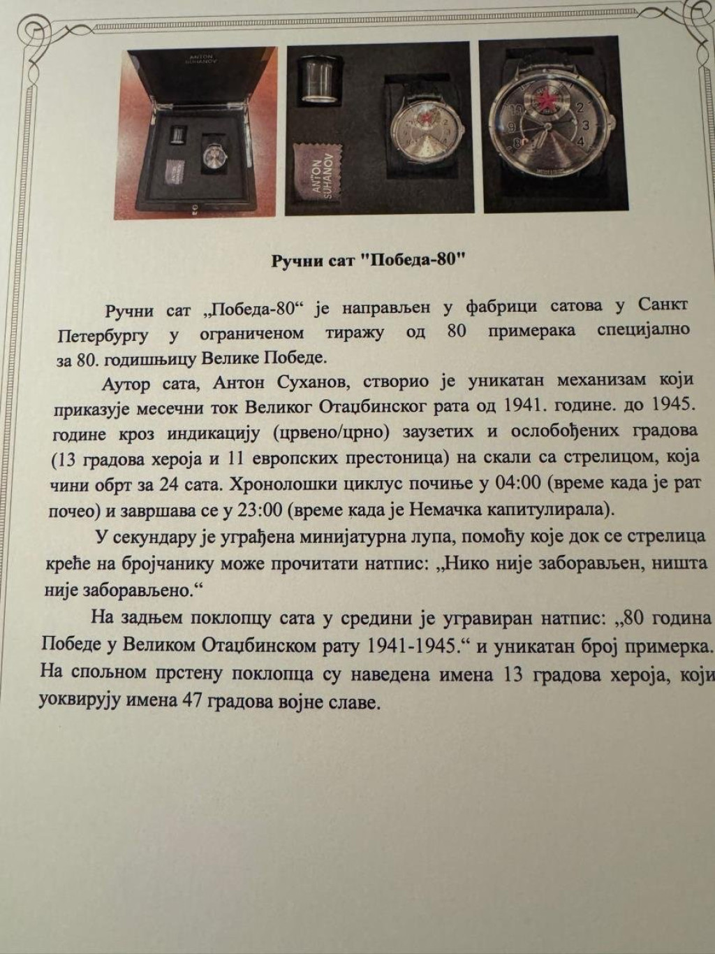 Među poklonima je i borbeni poklon set - koji se sastoji od automata Špagin, noža-bajoneta, šolje i pljoske, kao i ručni sat "Pobeda-80", koji je napravljen u fabrici satova u Sankt Peterburgu u ograničenom tiražu od 80 primeraka specijalno za 80. godišnjicu Velike pobede. Predsedniku su darovana i ruska vina, kompanije Abrau-Durso, koja je vodeći ruski proizvođač vina, prepoznata i u svetu.