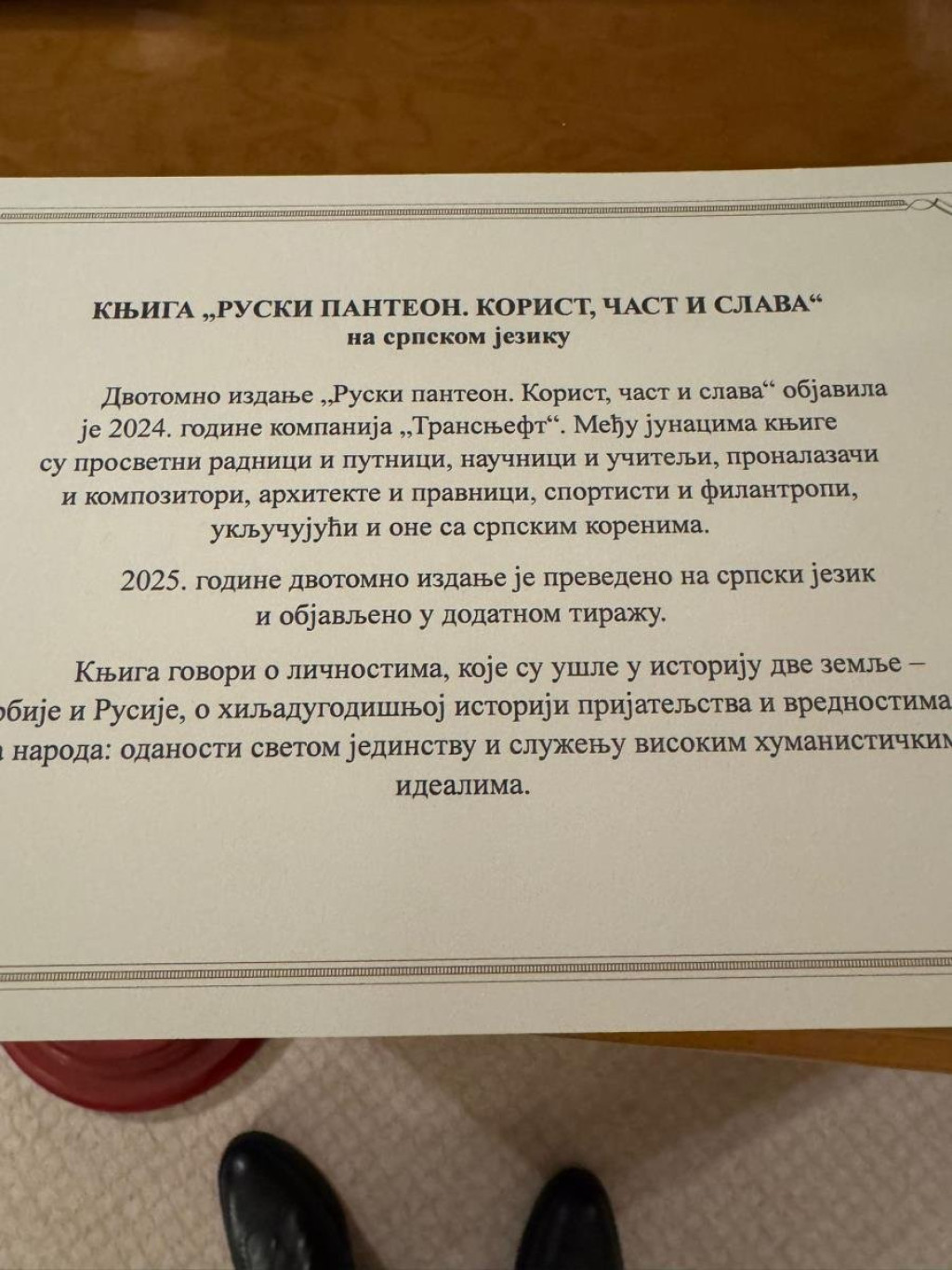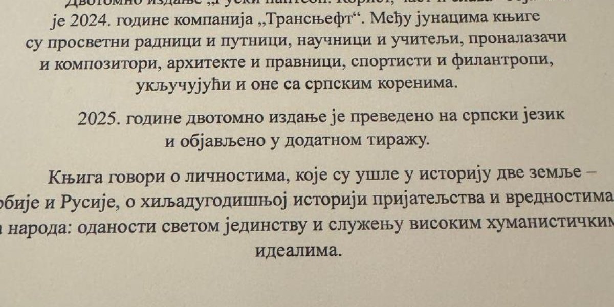 Naime, kako se vidi po fotografijama koje je objavio Kurir, Putin je Vučiću darovao knjigu "Ruski Panteon. Korist, čast i slava", dvotomno izdanje na srpskom jeziku, o prosvetnim radnicima i putnicima, naučnicima i učiteljima, pronalazačima i kompozitorima, arhitektama i pravnicima, sportistima i filantropima, uključujući i one sa srpskim korenima.