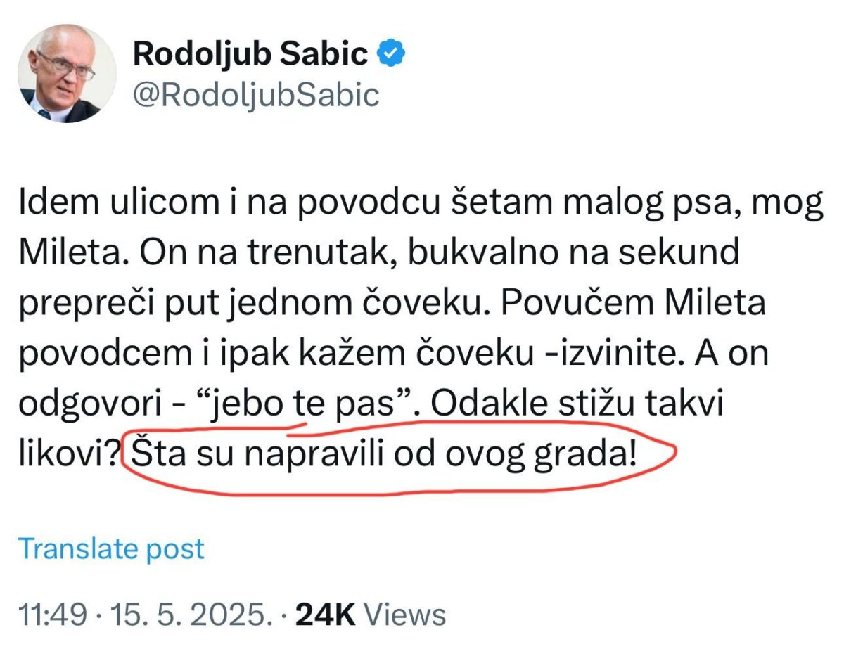 ''Idem ulicom i na povodcu šetam malog psa, mog Mileta. On na trenutak, bukvalno na sekund prepreči put jednom čoveku. Povučem Mileta povodcem i ipak kažem čoveku -izvinite. A on odgovori - "jebo te pas". Odakle stižu takvi likovi? Šta su napravili od ovog grada!'', napisao je na svom Iks nalogu.