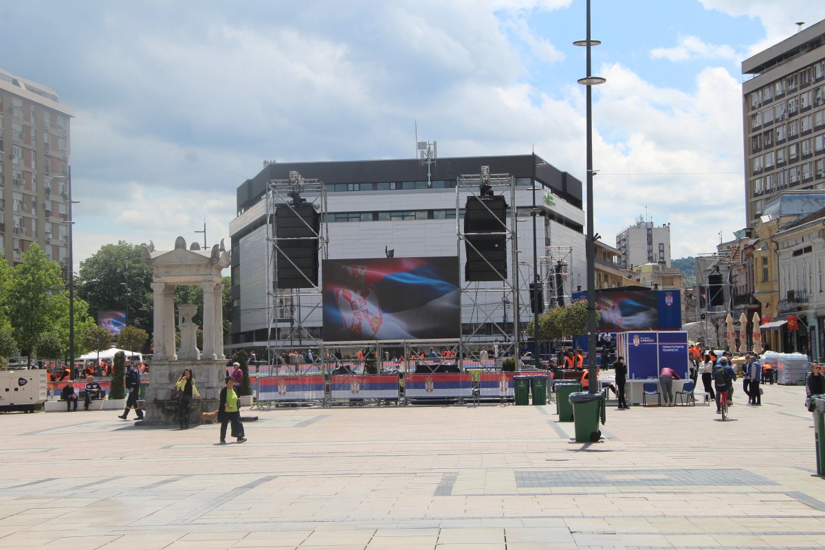Na bini koja je postavljena piše "Ne damo Srbiju", a postavljena su i dva video bima preko kojih će građani kasnije moći da prate program, a na kojima se sada vijori zastava Srbije.