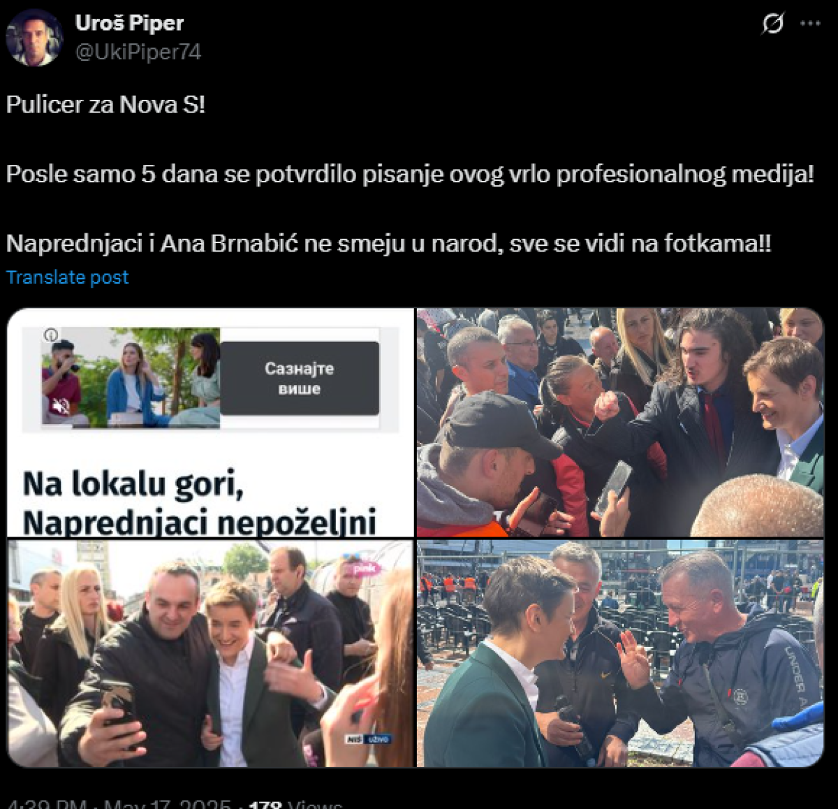 - Pulicer za Nova S! Posle samo 5 dana se potvrdilo da lažu! Brnabić i naprednjaci su među narodom, sve se vidi na fotkama! - poručio je Piper na mreži X, a podrška građana mu stiže sa svih strana.