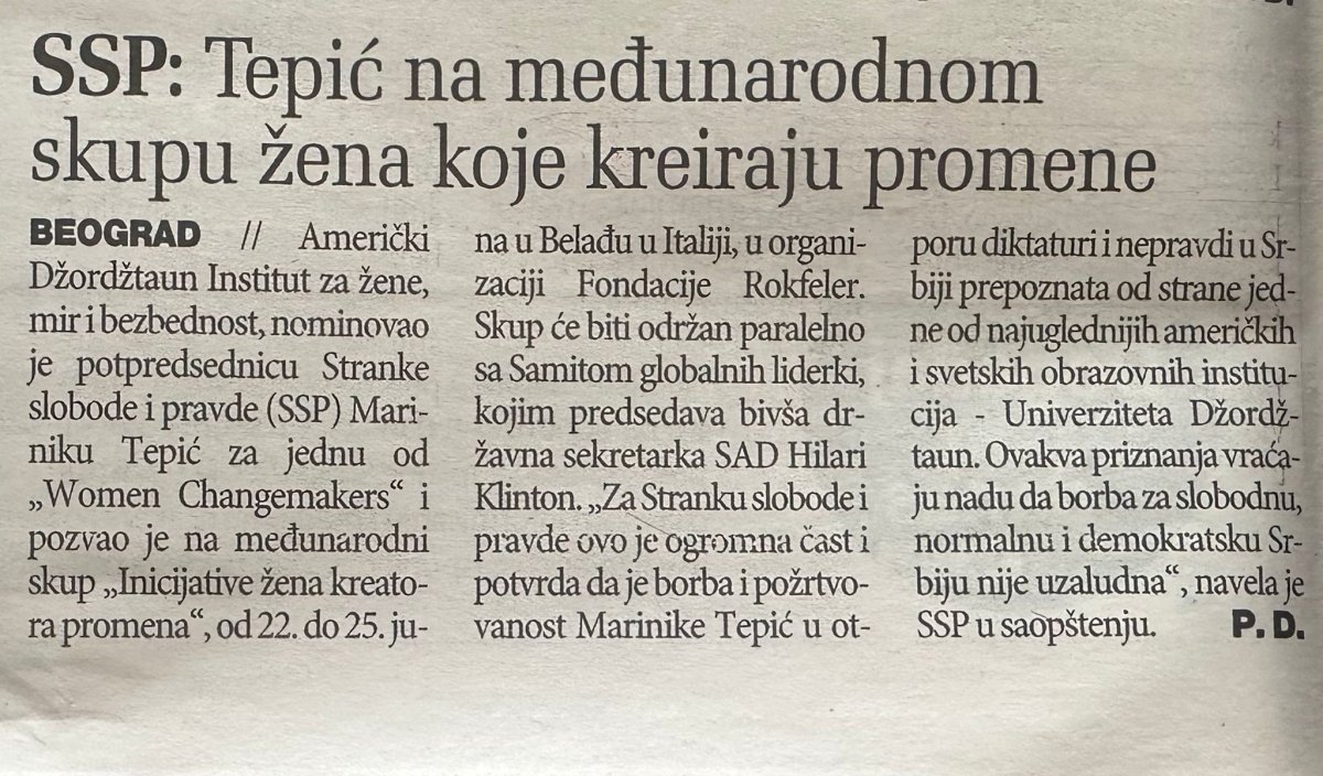 Stranka slobode i pravde sa ponosom obaveštava javnost da je potpredsednica SSP Marinika Tepić nominovana kao jedna od “Women Changemakers” liderki od strane američkog Džordžtaun Instituta za žene, mir i bezbednost… pic.twitter.com/6L5m5priLn