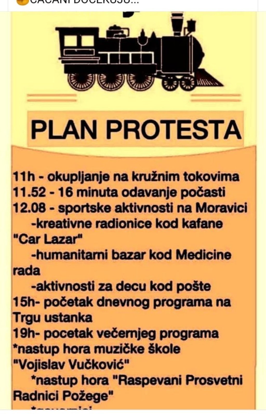 Na društvenim mrežama dele se pozivi na potpuni prekid rada trgovina, preduzeća i lokala, uz blokadu ključnih kružnih tokova - od Moravice, Lidla i ulice Cara Lazara.