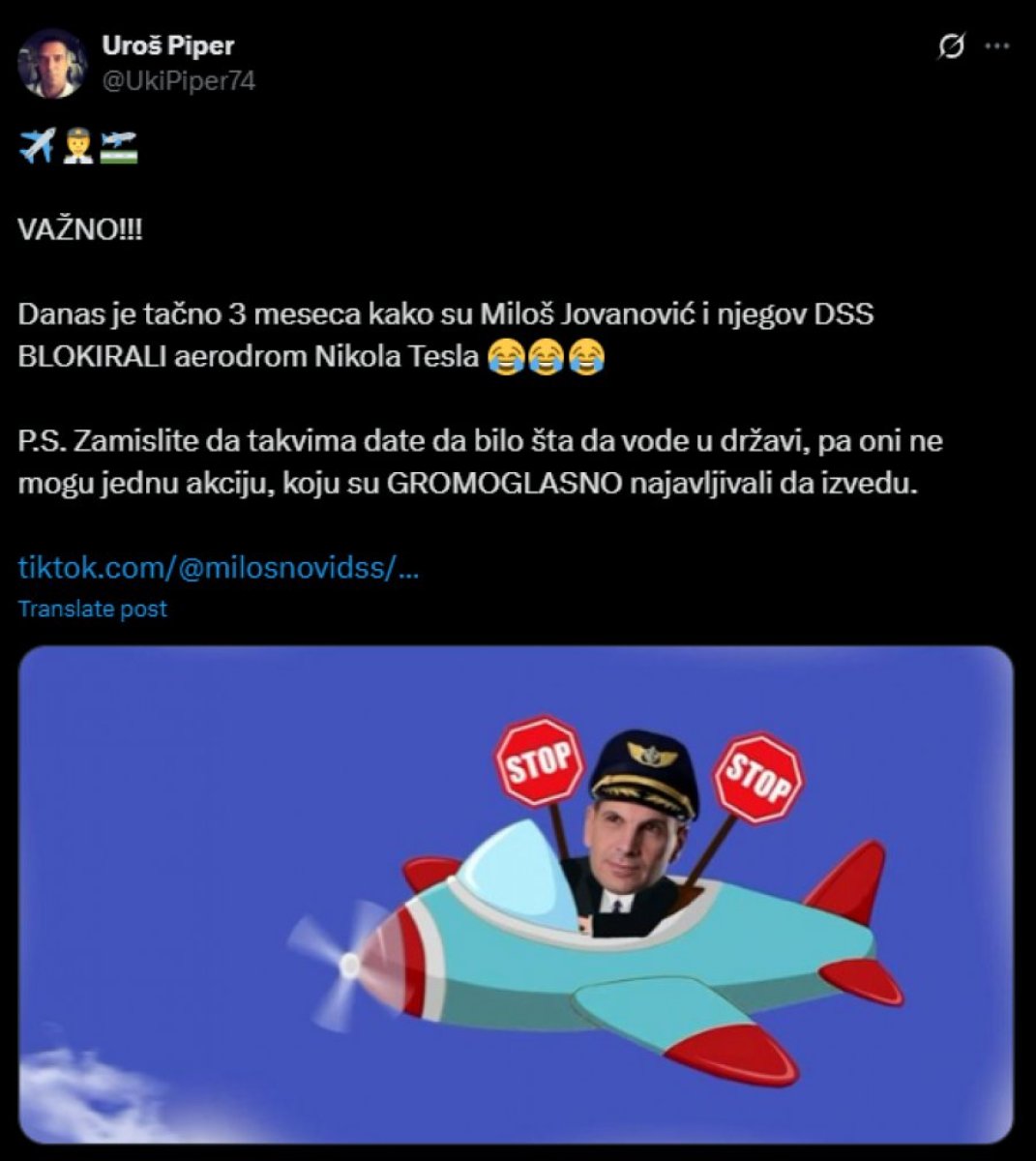 ''VAŽNO!!! Danas je tačno tri meseca kako su Miloš Jovanović i njegov DSS blokirali aerodrom Nikola Tesla. P.S. Zamislite da takvima date da bilo šta vode u državi, pa oni ne mogu jednu akciju koju su gromoglasno najavljivali da izvedu'', napisao je Jovanović na mreži Iks.