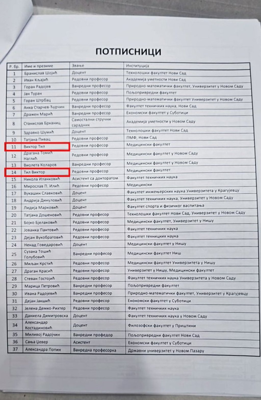 Nema potpisa, nema JMBG-a, nema broja lične karte - ali zato ima duplih ličnosti. Tako se vidi da je Viktor Til s Medicinskog fakulteta (u Novom Sadu, mada ni taj podatak ne piše u ovoj "peticiji"), na listi upisan dva puta.