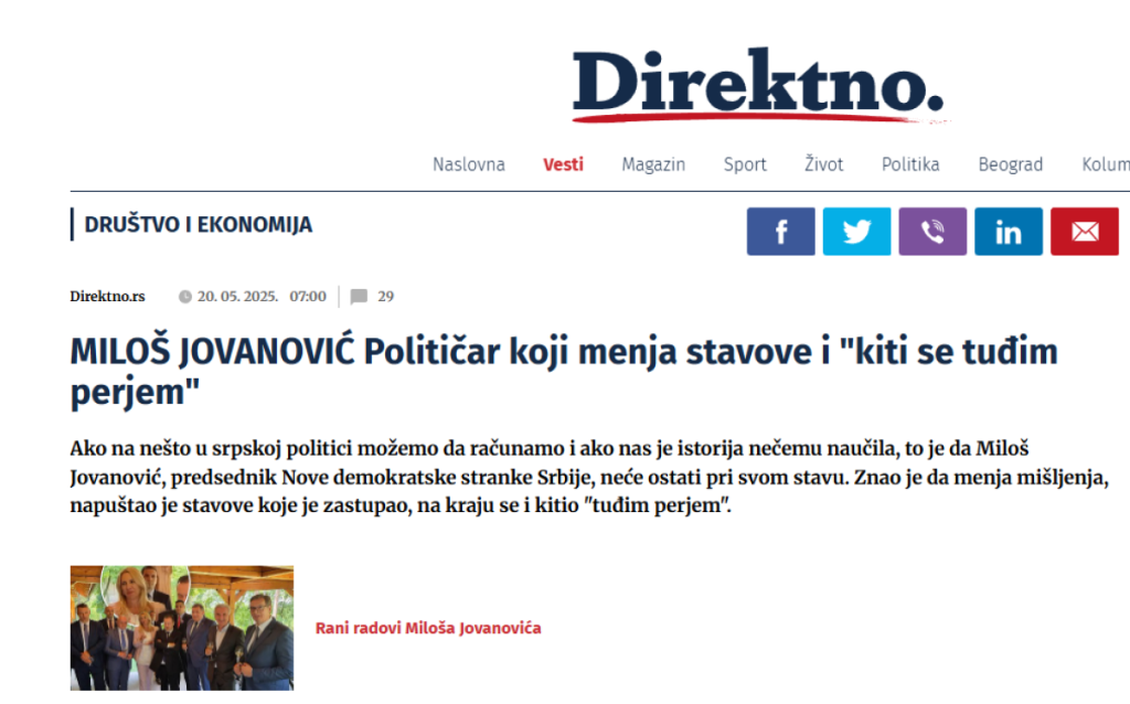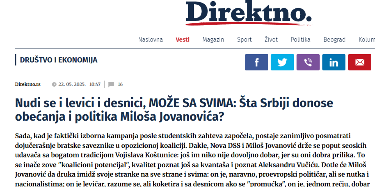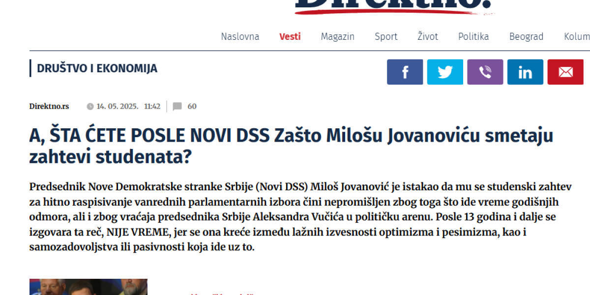 "Miloš Jovanović: Političar koji menja stavove i "kiti se tuđim perjem"", "Miloš Jovanović - večita izborna "udavača"", "Nudi se i levici i desnici, može sa svima: Šta Srbiji donose obećanja i politika Miloša Jovanovića?", "A, šta ćete posle Novi DSS - Zašto Milošu Jovanovicu smetaju zahtevi studenata?", naslovni su tekstova koji su objavljeni na tajkunskom portalu Direktno od 14. do 22. maja, a sve je kulminiralo tekstom objavljenim danas pod naslovom "Pritisci i napadi: Kome u Novom DSS (i oko njega) smeta Direktno.rs?"