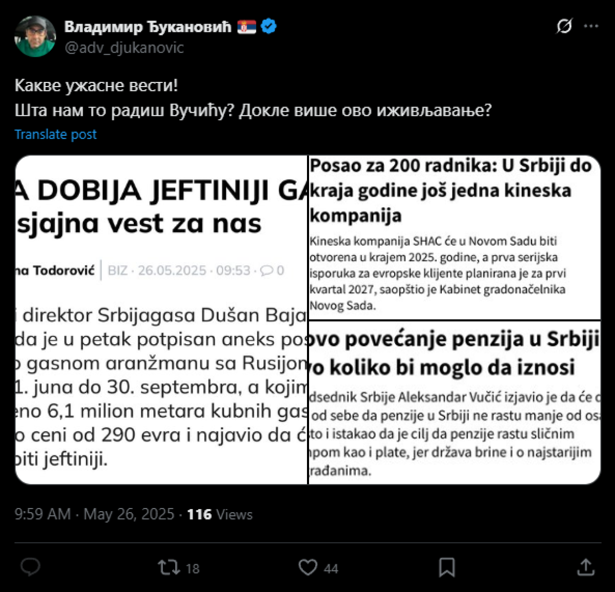 - Kakve užasne vesti! Šta nam to radiš, Vučiću? Dokle više ovo iživljavanje? - naveo je sarkastično Đukanović na "Iksu".