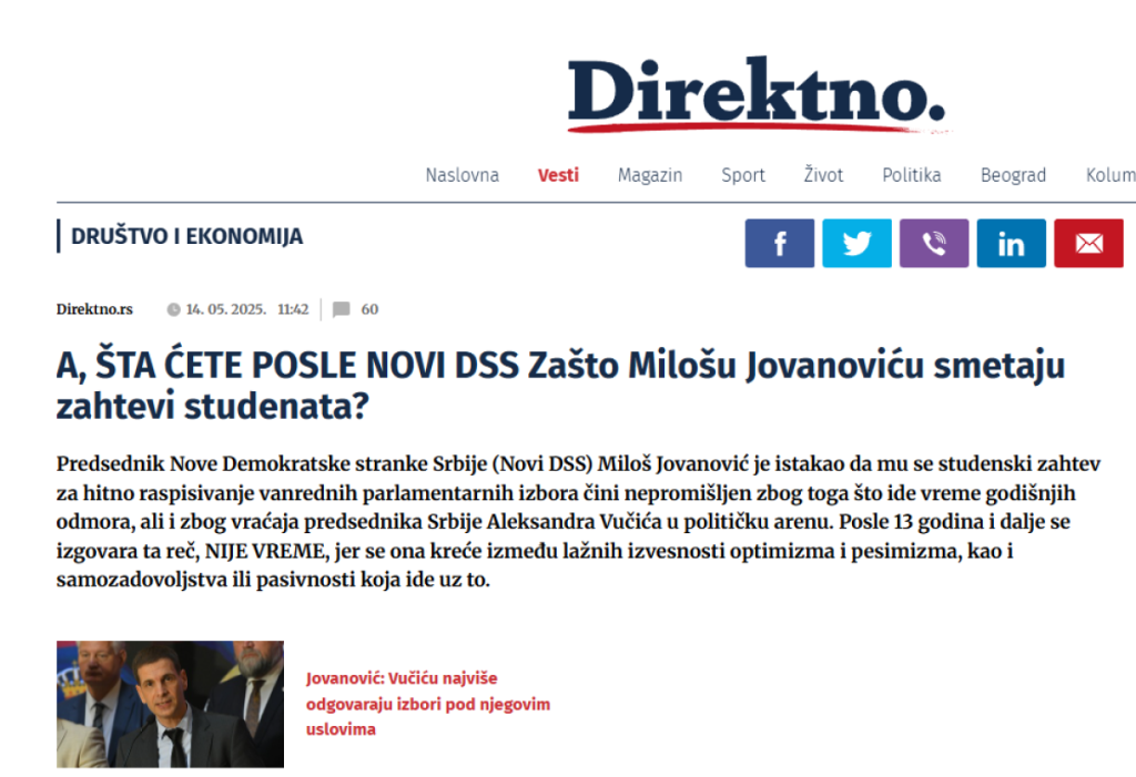 Tada je objavljen članak pod naslovom: "A, šta ćete posle Novi DSS - Zašto Milošu Jovanoviću smetaju zahtevi studenata?".