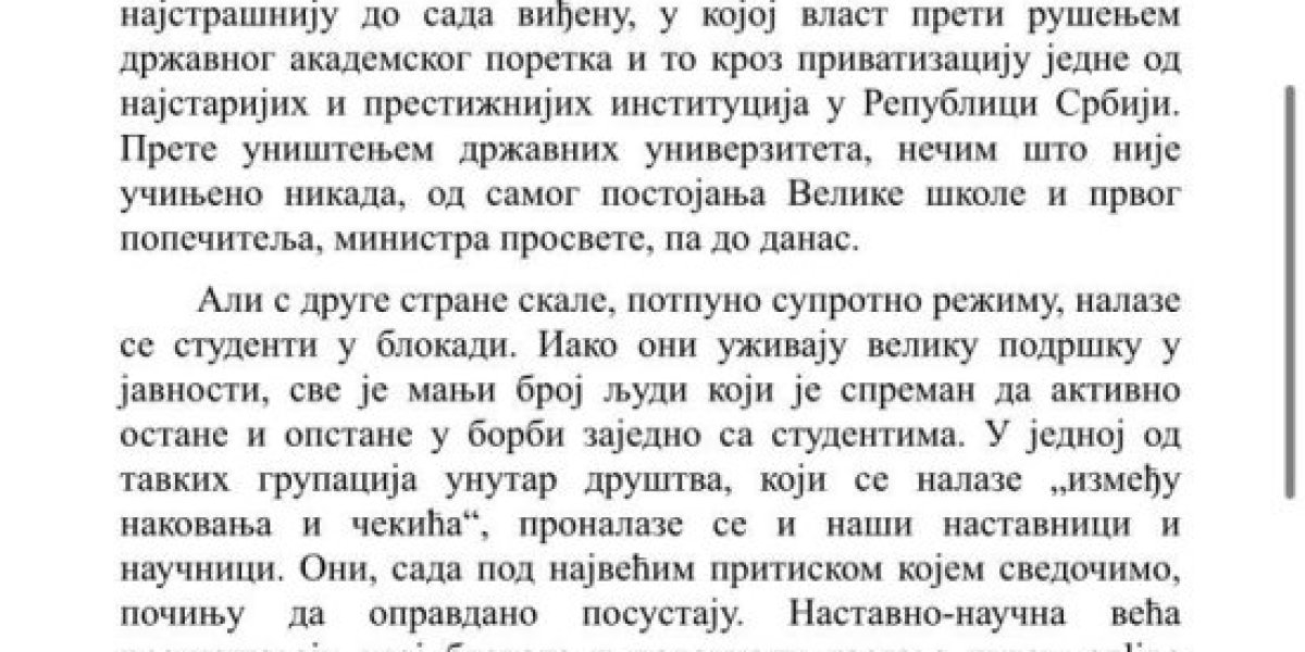 - Deca u Srbiji treba da uče sa aplikacije MUDL, profesori da drže predavanja online, a šta ćemo sa medicinskim, građevinskim, arhitektonskim fakultetima? Kako da završe studije preko aplikacije?! Blokaderi su uništili jednu čitavu generaciju - rekao je Vučićević.