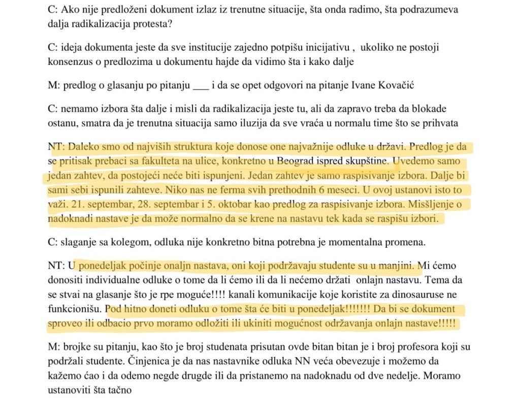 - Daleko smo od najviših struktura koje donose one najvažnije odluke u državi. Predlog je da se pritisak prebaci sa fakulteta na ulice, konkretno u Beograd ispred skupštine. Uvedemo samo jedan zahtev, da postojeći neće biti ispunjeni. Jedan zahtev je samo raspisivanje izbora - piše između ostalog u zapisniku.