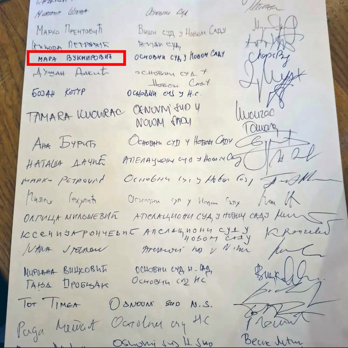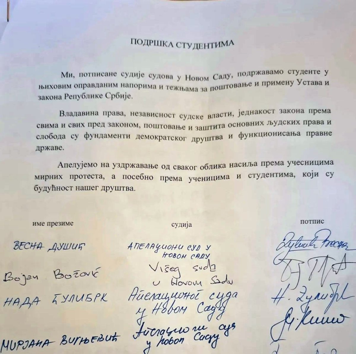Naime, ona se potpisala ispod sramnog dokumenta u kom sudije iz Novog Sada navode da podržavaju studente blokadere u njihovim "opravdanim naporima i težnjama".