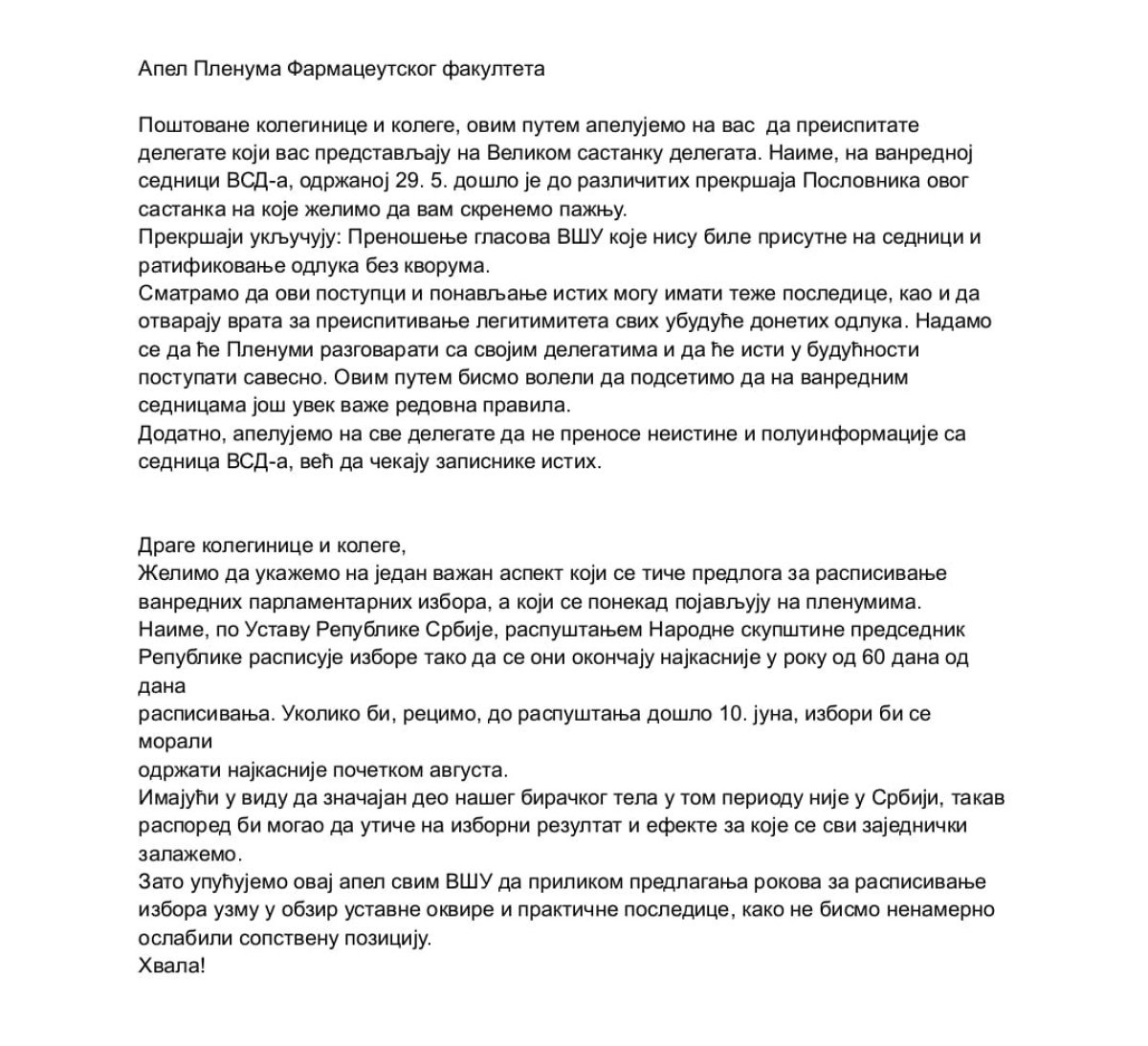 Plenum sa Farmacije "apeluje" da se na VSD vise ne lažiraju i ne usvajaju odluke bez kvoruma i da ne žele izbore početkom juna jer se plaše da njihovi predstavnici neće bit tu.