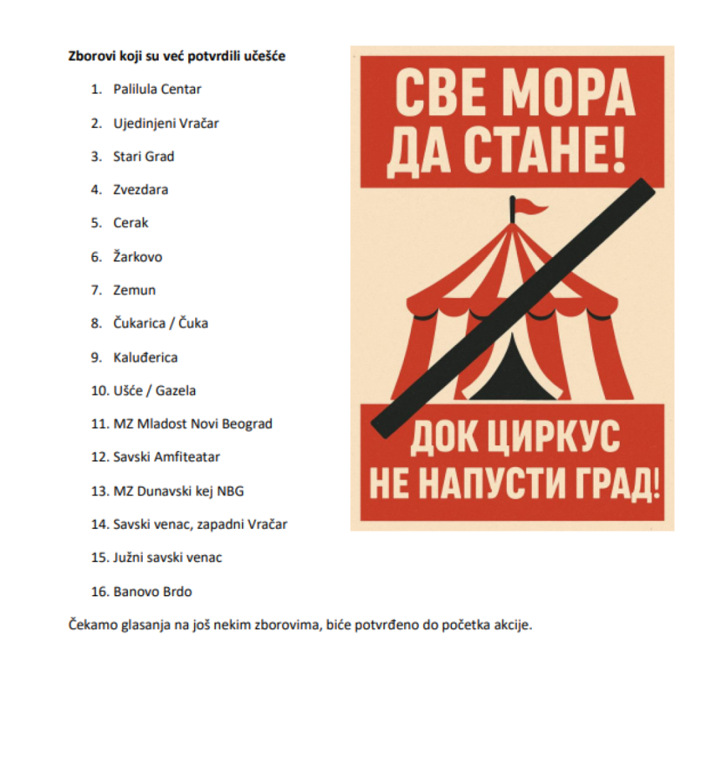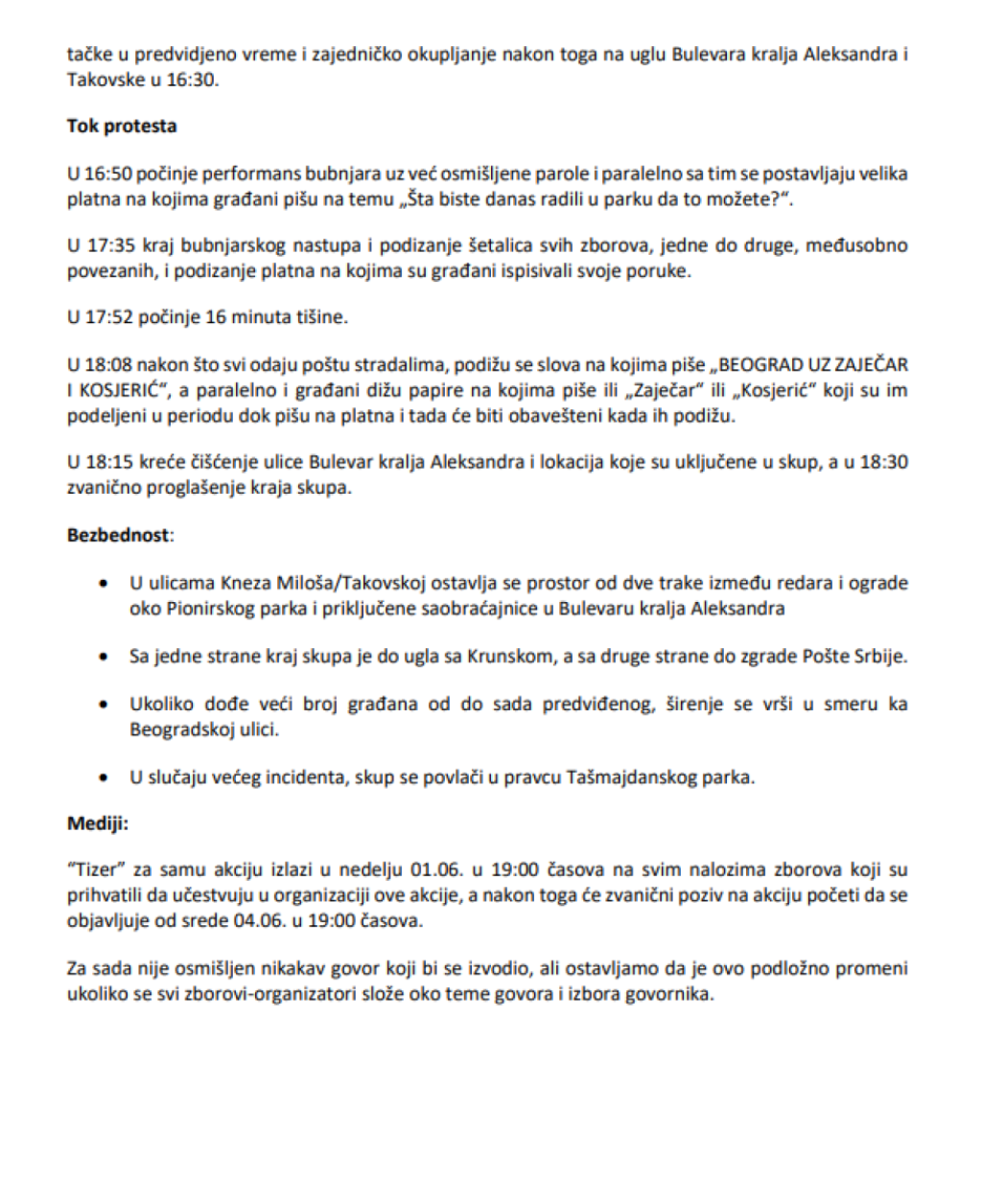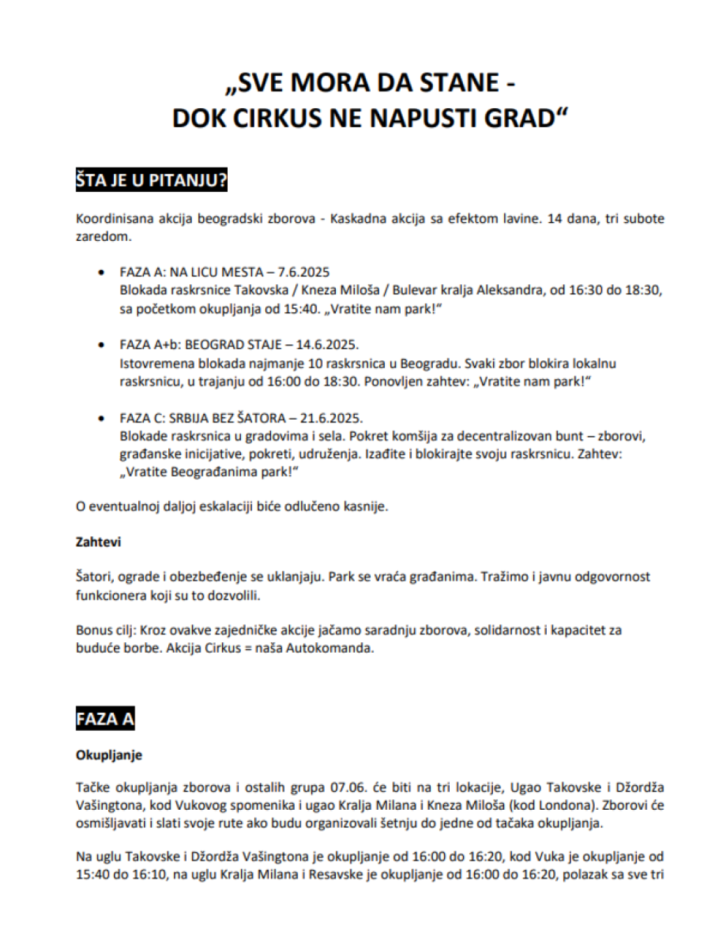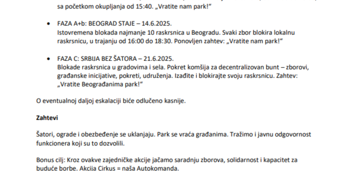 21. juna, kako saznajemo, planirane su blokade raskrsnica u gradovima i selima, a zahtev koji će tada blokaderi istaći sažet je u sloganu „Vratite Beograđanima park".