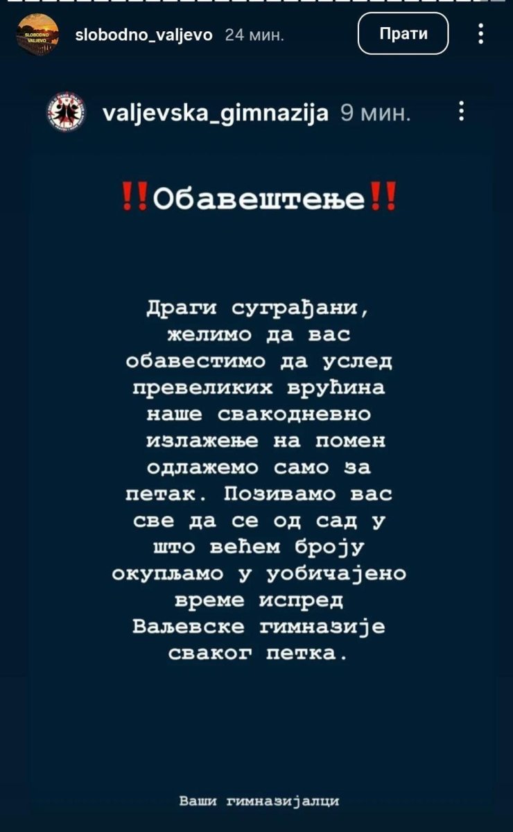 "Pozivamo vas da se od sad u što većem broju okupljamo u uobičajeno vreme ispred Valjevske gimnazije svakog petka", navodi se u saopštenju.