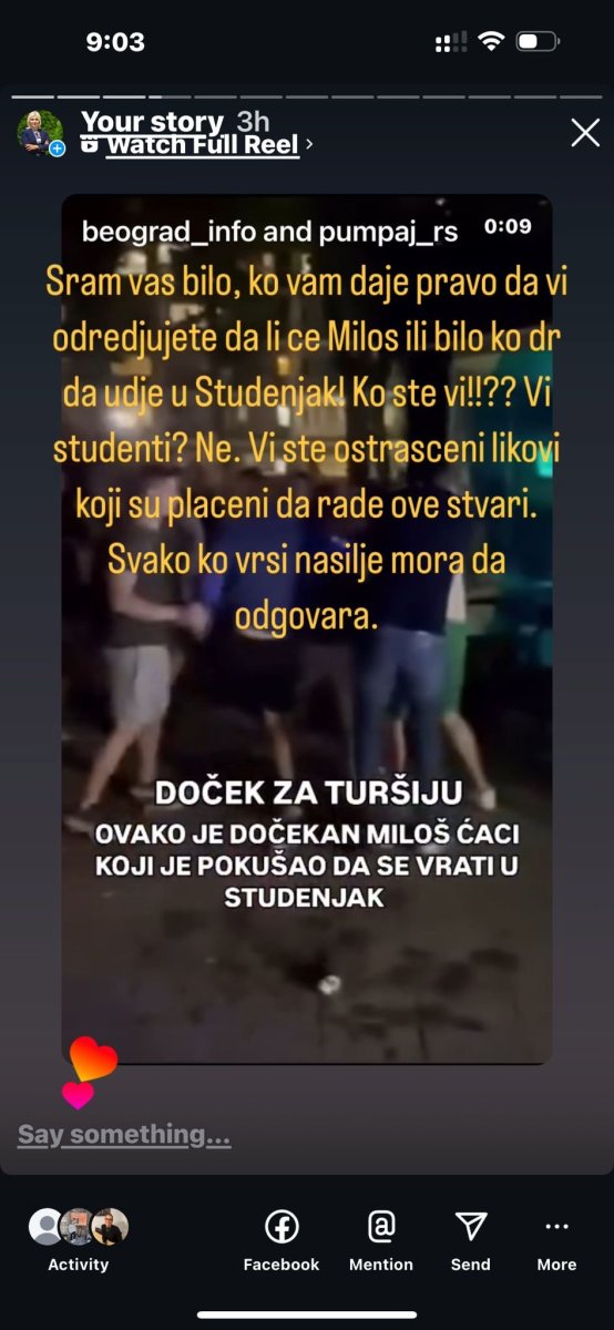 Na svom Instagram nalogu uputila je oštru poruku nasilnicima i onima koji, kako kaže, pokušavaju da glume "studente" dok zapravo šire mržnju i nasilje!