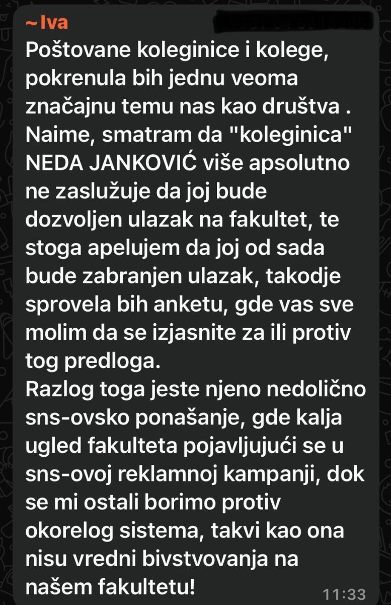 Izvesna blokaderka Iva u jednoj vajber grupi na Pravnom fakultetu zatražila je od kolega da zabrane ulazak koleginici Nedi J. da uđe na fakultet, jer je Neda po njenim rečima članica naprednjaka.