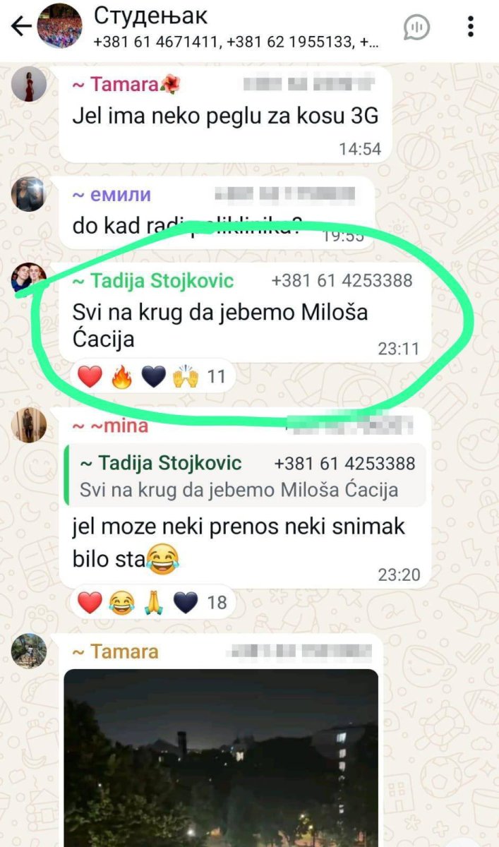 Policija je došla do saznanja, da je juče u 23.11 časova, Tadija Stojković (23) iz Jagodine u grupi "Studenjak" na aplikaciji "Whatsapp" poslao poruku u kojoj stoji: "Svi na krug da je*emo Miloša Ćacija".