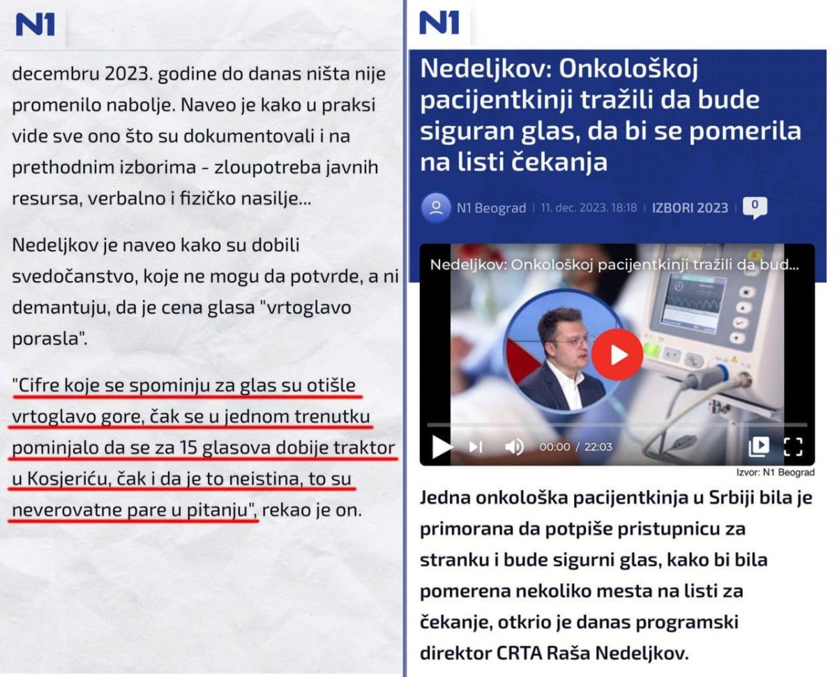 Nedeljkov je pred izbore 2023. godine gostujući na opozicionoj televiziji otvoreno slagao da je navodno SNS tražio od onkološke pacijentkinje da bude siguran glas i da će tako biti pomerena na listi za čekanje. Ove sramne optužbe nikada nisu dokaze, a javnost nikada nije ni saznala njeno ime.