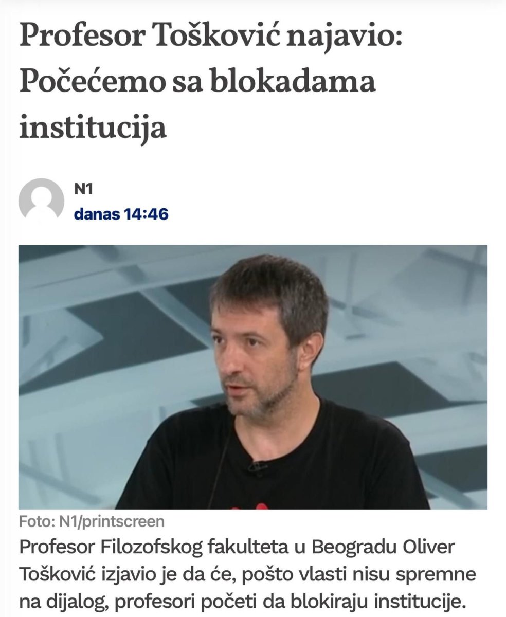 Tošković, koji je bio jedan od profesora koje je saslušavao plenum Filozofskog fakulteta, sada je za opozicione medije rekao da će njegove kolege morati da ''pojačaju pritisak na ulicama''.