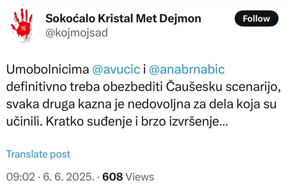 "Umobolnicima Aleksandru Vučiću i Ani Brnabić definitivno treba obezbediti Čaušesku scenario, svaka druga kazna je nedovoljna za dela koja su učinili. Kratko suđenje i brzo izvršenje...", navedeno je u njegovoj objavi na toj mreži.