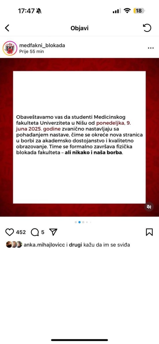"Obaveštavamo vas da studenti Medicinskog fakulteta Univerziteta u Nišu od ponedeljka, 9. juna 2025. godine zvanično nastavljaju sa pohađanjem nastave, čime se okreće nova stranica u borbi za akademsko dostojanstvo i kvalitetno obrazovanje. Time se formalno završava fizička blokada fakulteta - ali nikako i naša borba."