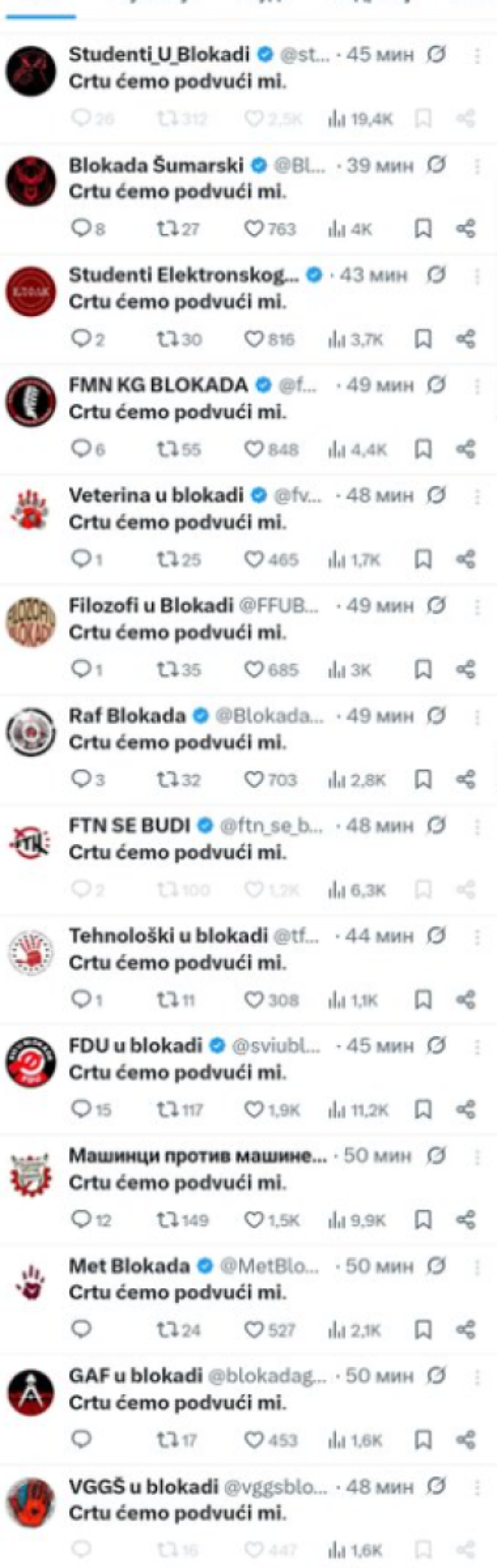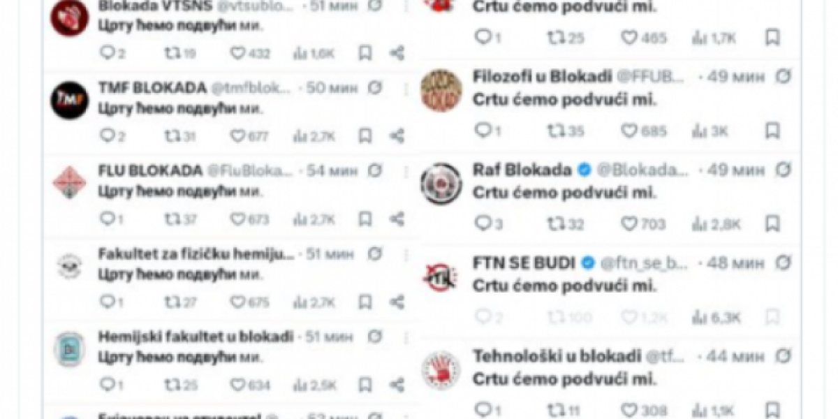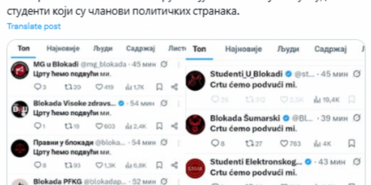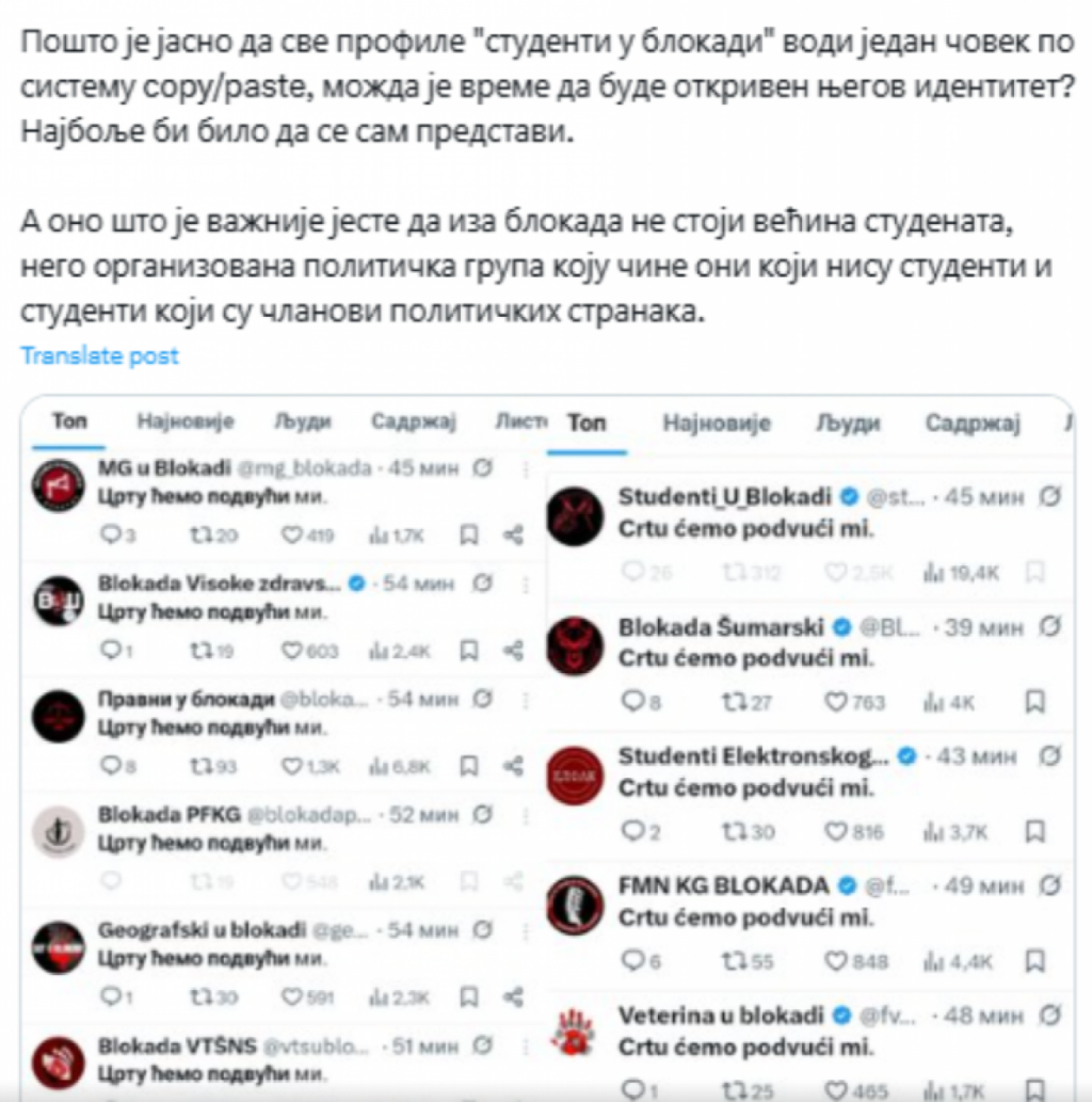 - Pošto je jasno da sve profile "studenti u blokadi" vodi jedan čovek po sistemu copy/paste, možda je vreme da bude otkriven njegov identitet? Najbolje bi bilo da se sam predstavi - navodi se u komentaru na drušvenoj mreži iks ispod posta u kojem je istaknuta identična fraza.