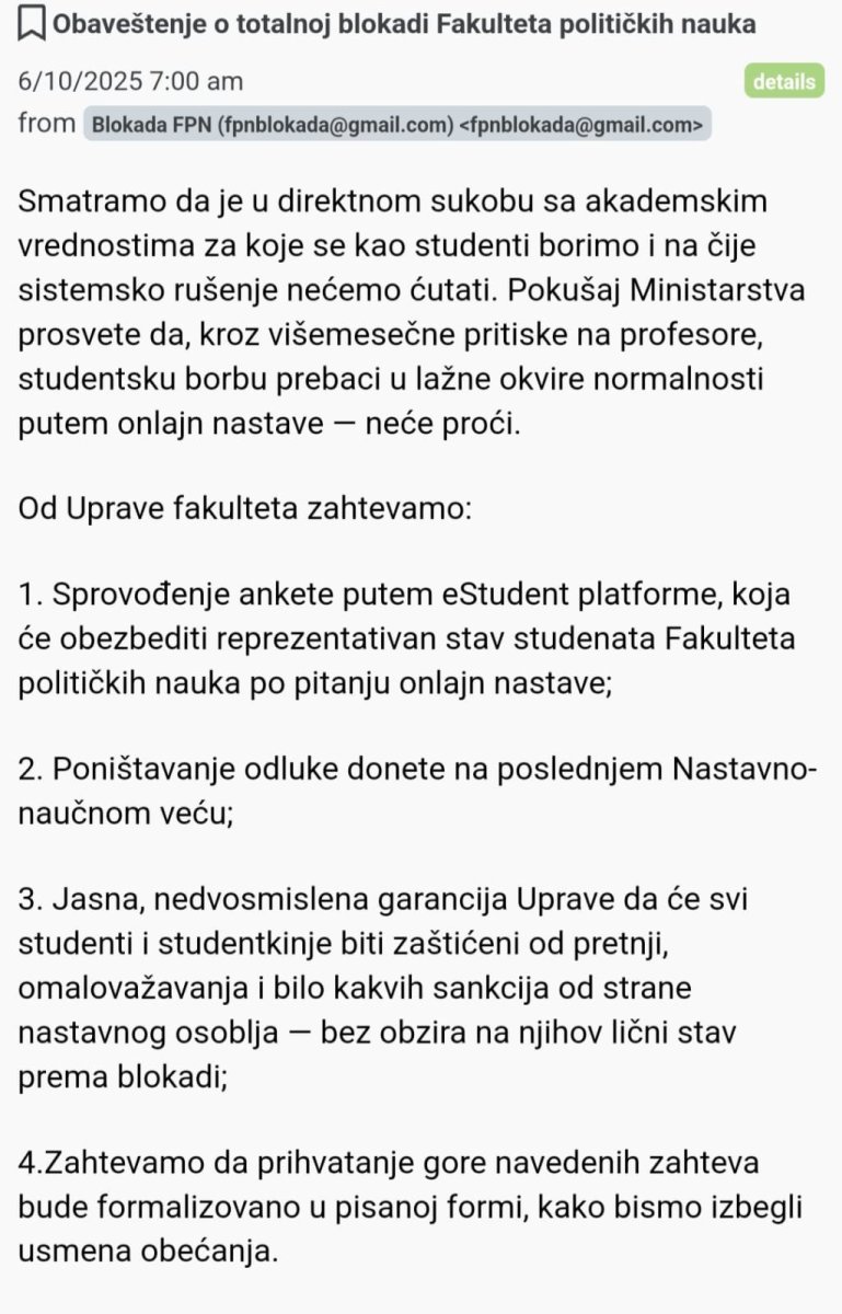 Imali smo u vid u mejl kojim su obavestili javnost da ignorišu odluke fakulteta i naveli svoje zahteve.