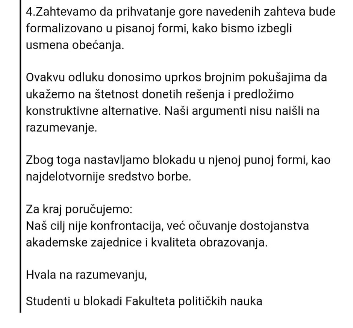 ''Mi studenti u blokadi FPN-a obaveštavamo javnost da od ovog trenutka stupanom u totalnu blokadu zgrade Fakulteta'', napisali su blokaderi, između ostalog, u mejlu.