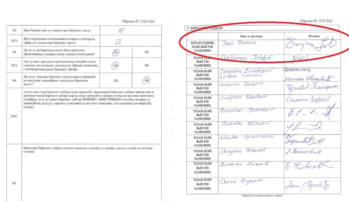 Bencun navodi da je predao izborni materijal kompletan bez ikakve primedbe, a po podacima koji su javno objavljeni na sajtu Republičke izborne komisije Republike Srbije vidi se da je on zaista bio predsednik biračkog odbora.