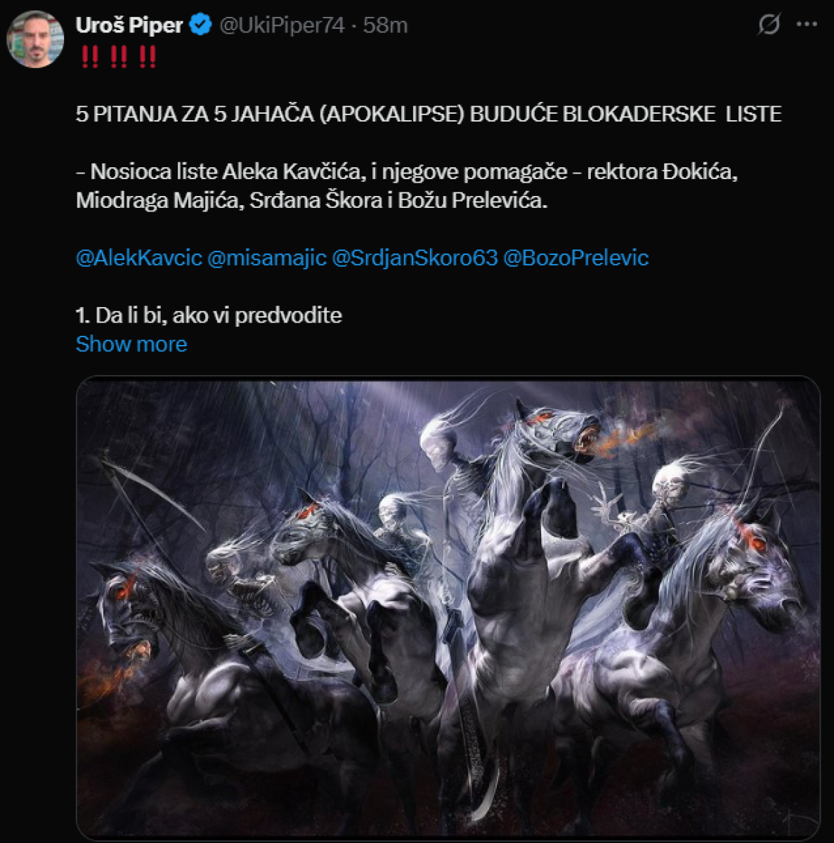 U direktnoj objavi na mreži X, Piper je postavio 5 ključnih pitanja na koja, kako kaže, "narod Srbije zaslužuje jasne i konkretne odgovore, a ne mlaku priču kao na izboru za Mis sveta!"