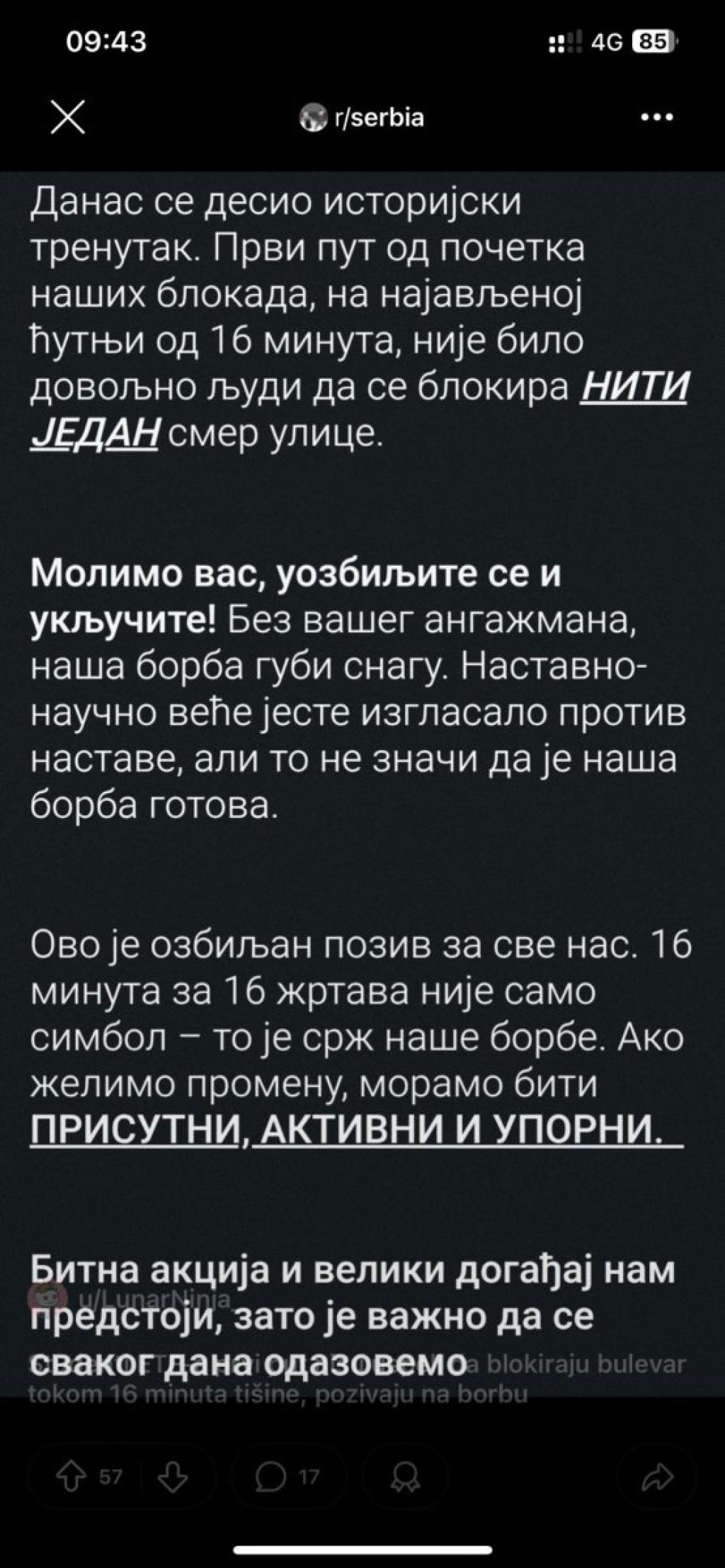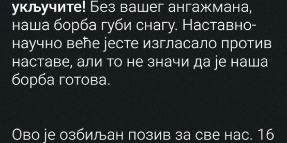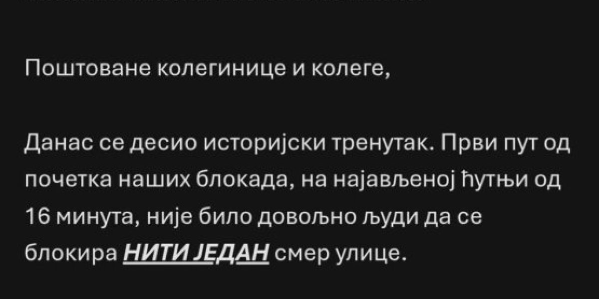 U istom mejlu, prodekan praktično moli akademsku zajednicu da se uključi u blokade i da "ozbiljno shvati situaciju", jer se sa sadašnjim brojem ne mogu zatvoriti ni 3 metra asfalta.