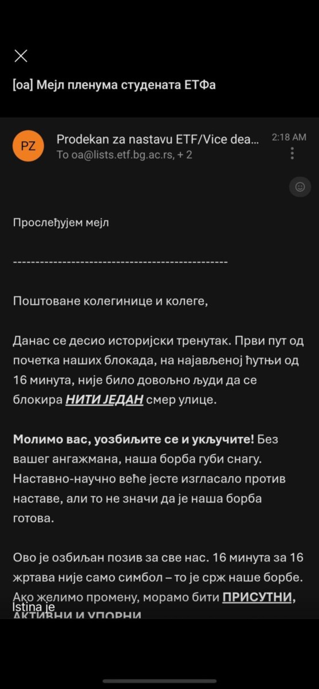 Međutim, sada je stigla i zvanična potvrda u vidu cirkularnog mejla prodekana ETF-a koji je upućen kolegama i koleginicama. U poruci se jasno navodi da "skup nije bio brojčano velik" i da 2nije bilo dovoljno ljudi da se blokira nijedan smer ulica".